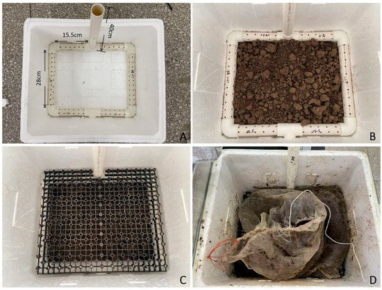 Schematic of the custom aerobic fermentation system used in this study. (A) Ventilation pipes at the system base. (B) Bottom layer covered with soil. (C) Spring spacer plate installed above the basal soil layer. (D) Nylon bags containing straw, microbial inoculants, and soil mixture arranged atop the spacer plate.