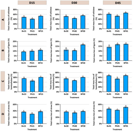 Temporal changes in straw degradation. Dynamics of (A) cellulose, (B) lignin, (C) hemicellulose, and (D) total straw mass loss over 45 days. Treatments: Bacillus velezensis (Bv), Pseudomonas helmanticensis (Ph), and co-inoculation (BP). Different lowercase letters indicate statistically significant differences between treatments at a given time point (p ≤ 0.05).