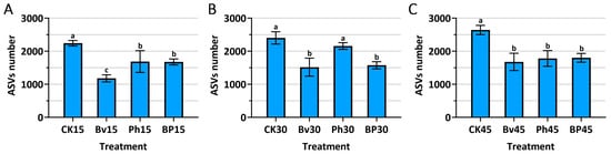 Soil microbial richness (Amplicon Sequence Variants, ASVs) in response to inoculation. (A) 15th day; (B) 30th day; (C) 45th day post-inoculation. Different letters above bars indicate significant differences between treatments at each time point (p ≤ 0.05). Abbreviations: CK, non-inoculated control; Bv, Bacillus velezensis monoinoculation; Ph, Pseudomonas helmanticensis monoinoculation; BP, B. velezensis + P. helmanticensis co-inoculation. Suffixes (15, 30, 45) indicate days post-inoculation (d).