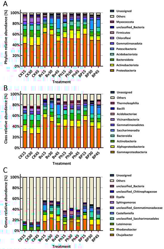 Microbial community composition at (A) phylum, (B) class, and (C) genus levels. Only the top 10 most abundant taxa are shown for each taxonomic rank. Abbreviations: CK, non-inoculated control; Bv, Bacillus velezensis monoinoculation; Ph, Pseudomonas helmanticensis monoinoculation; BP, B. velezensis + P. helmanticensis co-inoculation. Suffixes (15, 30, 45) indicate days post-inoculation (d).