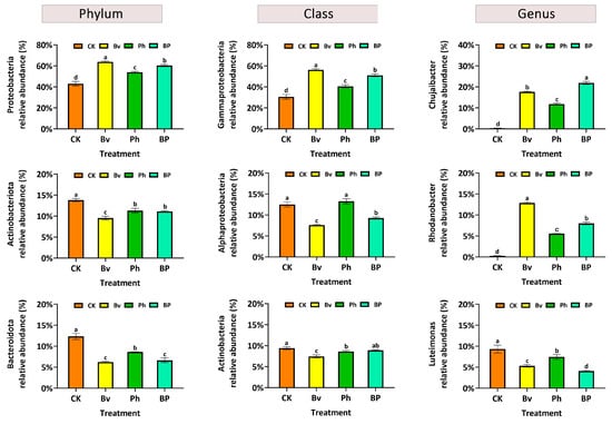 Relative abundance of the top three bacterial taxa at the phylum, class, and genus levels on day 15. Different letters indicate significant differences (p ≤ 0.05) among treatments across all time points. Abbreviations: CK, non-inoculated control; Bv, Bacillus velezensis monoinoculation; Ph, Pseudomonas helmanticensis monoinoculation; BP, B. velezensis + P. helmanticensis co-inoculation.