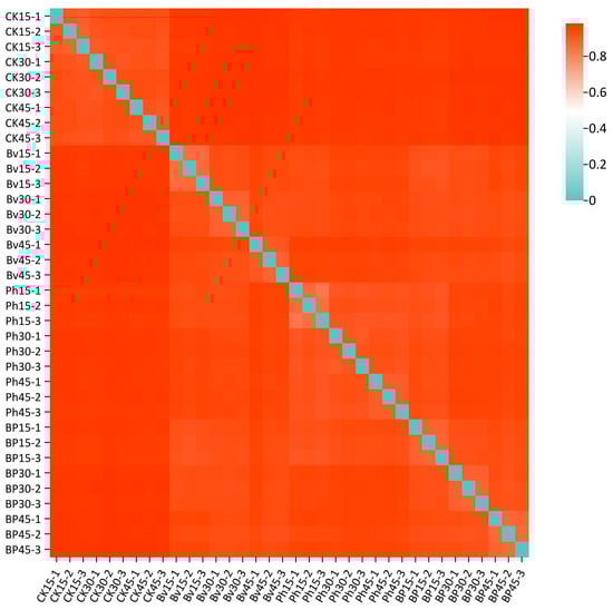 Beta diversity analysis, visualized through inter-sample dissimilarity heatmaps (Figure 8), revealed distinct clustering patterns reflecting compositional heterogeneity across taxonomic levels. Samples exhibiting similar color profiles demonstrated higher community structure similarity. The heatmap showed tight clustering among the nine CK replicates, while Bv, Ph, and BP treatments formed separate clusters comprising 27 inoculated samples. This divergence indicates significant microbial community restructuring induced by the inoculations. Furthermore, high within-treatment homogeneity was observed across all inoculated groups (9 Bv replicates, 9 Ph replicates, 9 BP replicates), demonstrating convergent shifts in soil microbial assemblages following bacterial amendment.