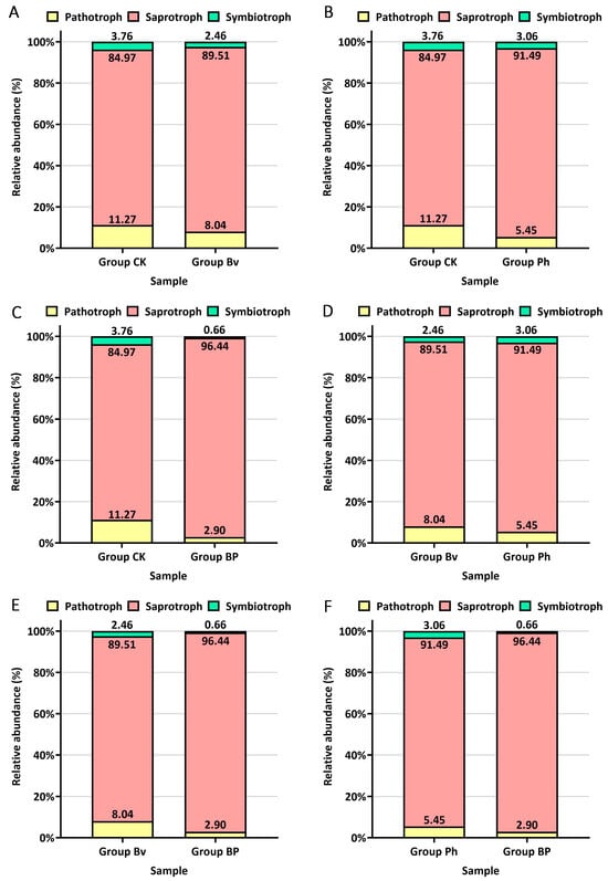 Functional guilds of fungal communities predicted by FUNGuild. Comparisons of the relative abundance of pathotrophs, symbiotrophs, and saprotrophs between different treatment groups: (A) CK vs. Bv, (B) CK vs. Ph, (C) CK vs. BP, (D) Bv vs. Ph, (E) Bv vs. BP, (F) Ph vs. BP.