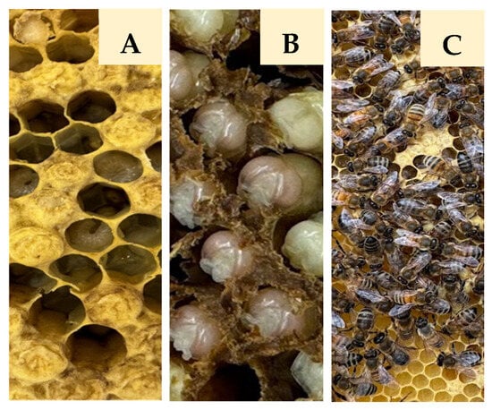 Honey bee colonies are highly organized social units comprising thousands of individuals. Each colony typically includes a few hundred males (drones), thousands of female workers, and a single reproductive queen []. The life cycle of the honey bee consists of four developmental stages: egg, larva, pupa, and adult []. After three days, the egg hatches into a white, legless, worm-like larva that is fed by worker bees. Nine days after the larva hatches, the honeycomb cells are sealed with a thin wax layer to allow the pupa to develop and then undergo a series of body changes until the emergence of an adult bee []. Worker bees perform diverse tasks essential for colony survival, including comb construction, food transportation, and hive defense, while drones are responsible for the fertilization of the queens [].