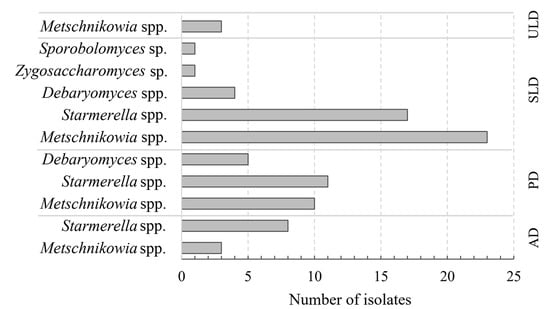 Identification of yeasts isolated from different stages of honey bee drone (ULD—unsealed larvae; SLD—sealed larvae; PD—pupae; AD—adults).