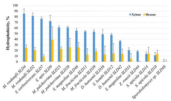 When hydrocarbon was changed to hexane, S. apis SLD9 showed the strongest hydrophobicity (39.4%), followed by S. magnoliae SLD46 (25.5%), M. pulcherima (SLD25 and SLD20) (25.7% and 22.8%, respectively), and M. reukaufii (SLD4 and SLD2) (25% and 20.4%, respectively). These hydrophobicity results mainly confirm those obtained in the xylene test. The lowest hydrophobicity was observed for S. sorbosivorans SLD7 (9.2%) and Z. rouxii SLD44 (0.1%). As with xylene, negligible (<1%) hydrophobicity properties were observed in Sporobolomyces sp. SLD48.