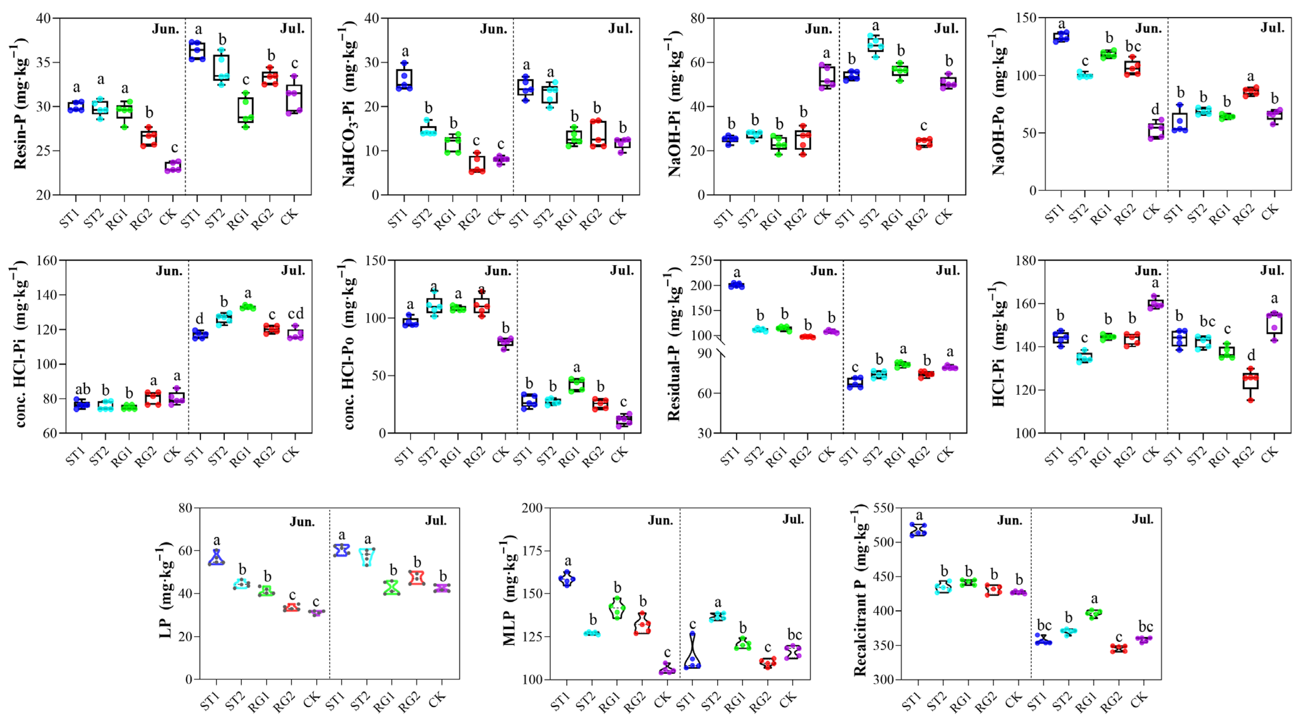 Figure 1. Effects of different rest-grazing periods on soil inorganic (Pi) and organic P (Po) fractions. LP (Labile-P) = Resin-P + NaHCO3-Pi; MLP (Moderately labile-P) = NaOH-Pi + NaOH-Po; Recalcitrant-P = conc. HCl-Pi + conc. HCl-Po + Residual-P + HCl-Pi. Different lowercase letters in the figure indicate significant differences between treatments (p < 0.05). Topsoil samples were collected on 2 June (Jun.) and 18 July (Jul.) in 2022, respectively. ST1, ST2, RG1, RG2, and CK indicates different rest-grazing treatments, including soil surface which began to thaw, soil thawing depth was more than 10 cm, re-greening coverage reached 30–40%, re-greening coverage reached 80%, dominant plant height ~5 cm, respectively.