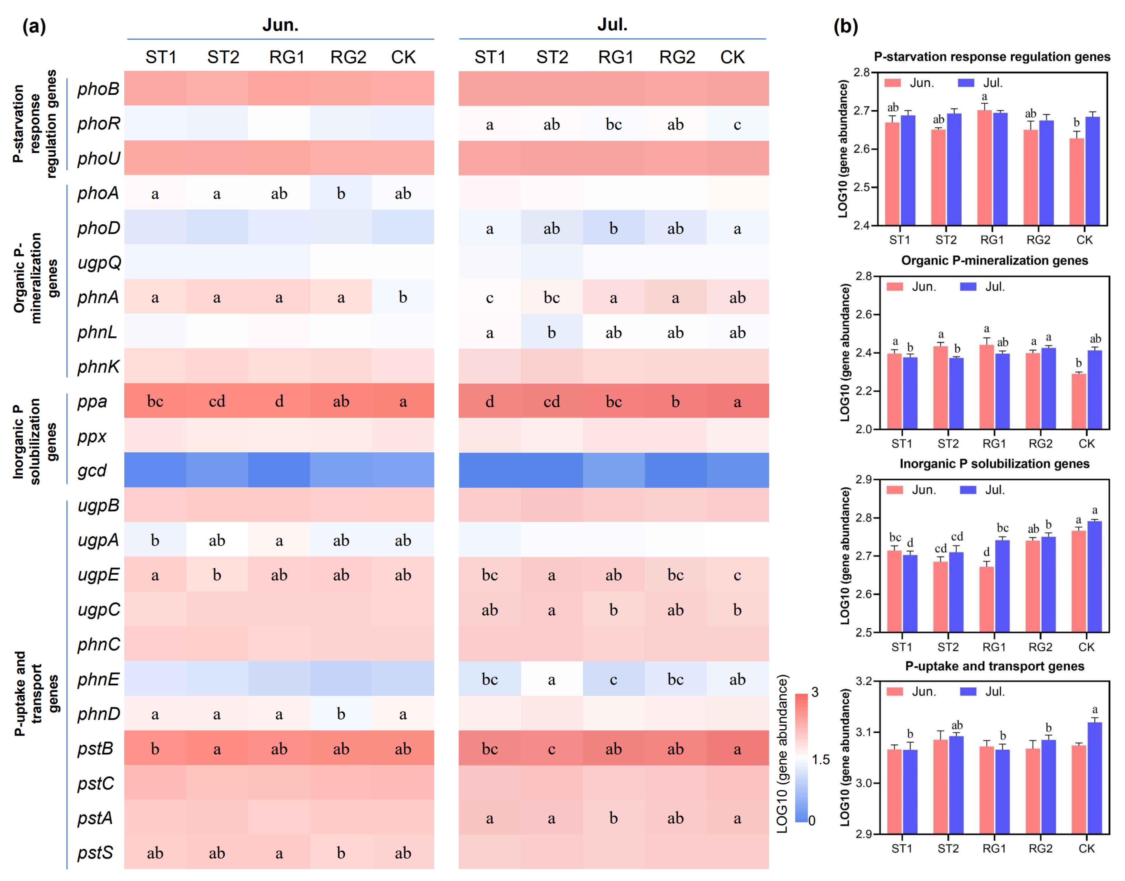 Figure 3.  Abundances of soil P-cycling functional genes in response to different rest-grazing periods. (a) The heat map presents the log10-transformed abundances of 21 genes related to soil P-cycling. (b) The bar plot shows the log10-transformed total abundances of functional genes related to P-starvation, organic P-mineralization, inorganic P solubilization, and P-uptake and transport. Different lowercase letters indicate significant differences between treatments (p < 0.05). Topsoil samples were collected on 2 June (Jun.) and 18 July (Jul.) in 2022, respectively. ST1, ST2, RG1, RG2, and CK indicate different rest-grazing treatments, including soil surface which began to thaw, soil thawing depth was more than 10 cm, re-greening coverage reached 30–40%, re-greening coverage reached 80%, dominant plant height ~5 cm, respectively.