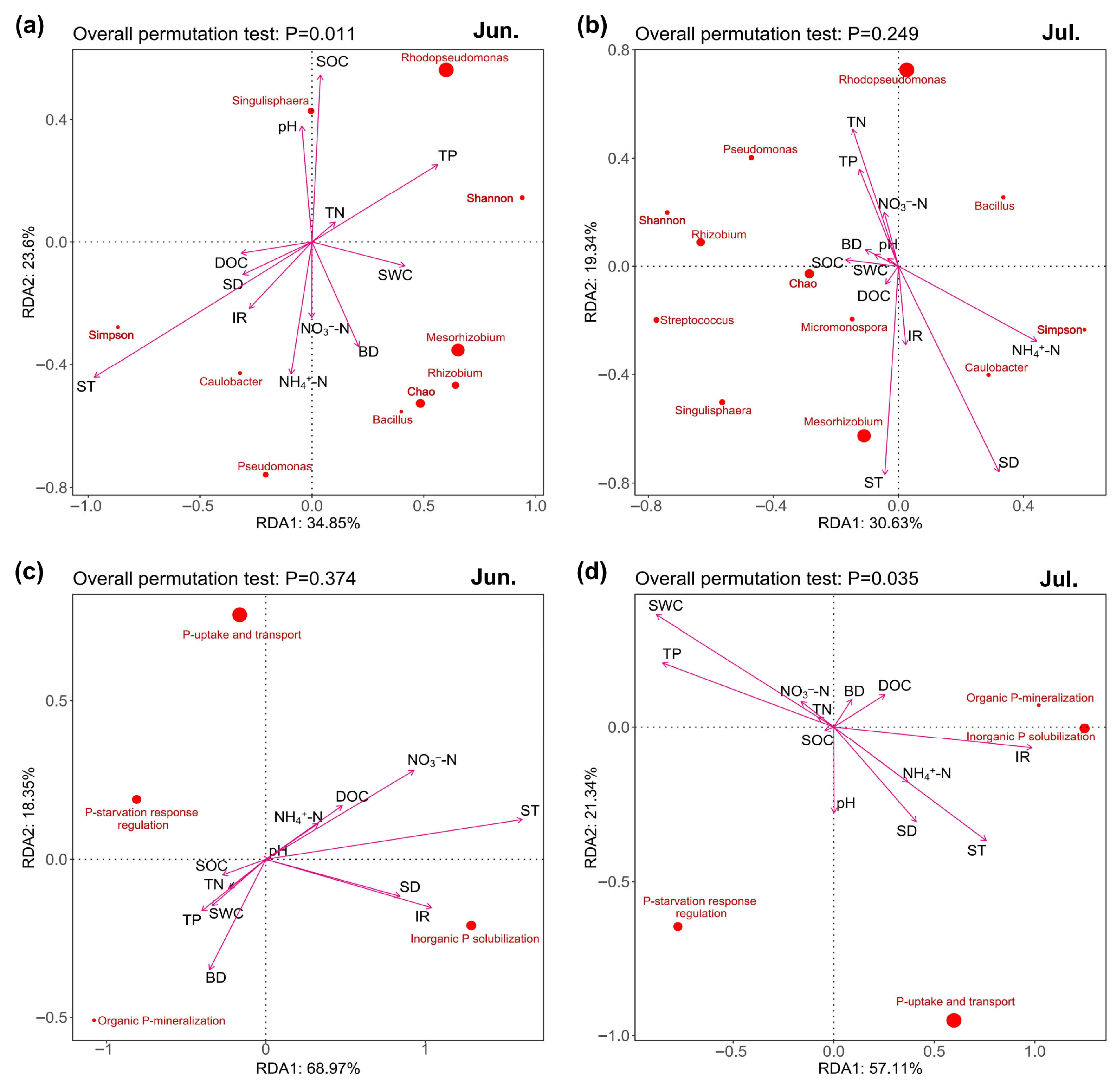 RDA analysis also showed that ST and IR were important environmental factors for soil P-cycling microbial community functional genes (Figure 4a–d). ST and IR were positively correlated with the collective abundances of inorganic P solubilization genes on both sampling dates (Figure 4c,d and Figure S1b), and positively correlated with the Simpson index, but negatively correlated with the abundance of Rhodopseudomonas in June (Figure 4a and Figure S1a). Moreover, the Simpson index positively correlated with the collective abundances of inorganic P solubilization genes on both sampling dates (Figure S1c). The abundance of Rhodopseudomonas positively correlated with P-starvation response regulation, organic P-mineralization, and inorganic P solubilization genes in June (Figure S1c).