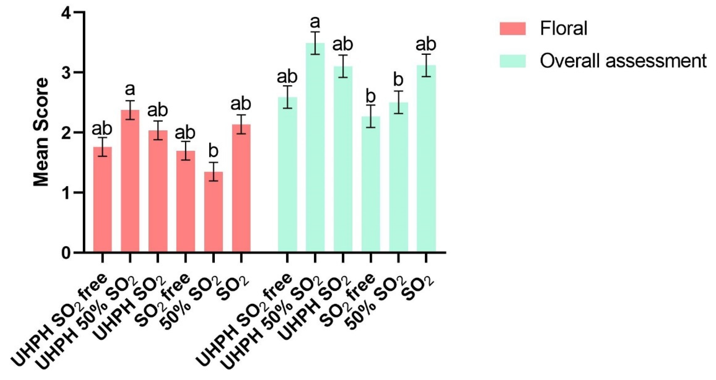Figure 7). The best-rated wine by floral and overall assessment attributes was, in both cases, UHPH 50% SO