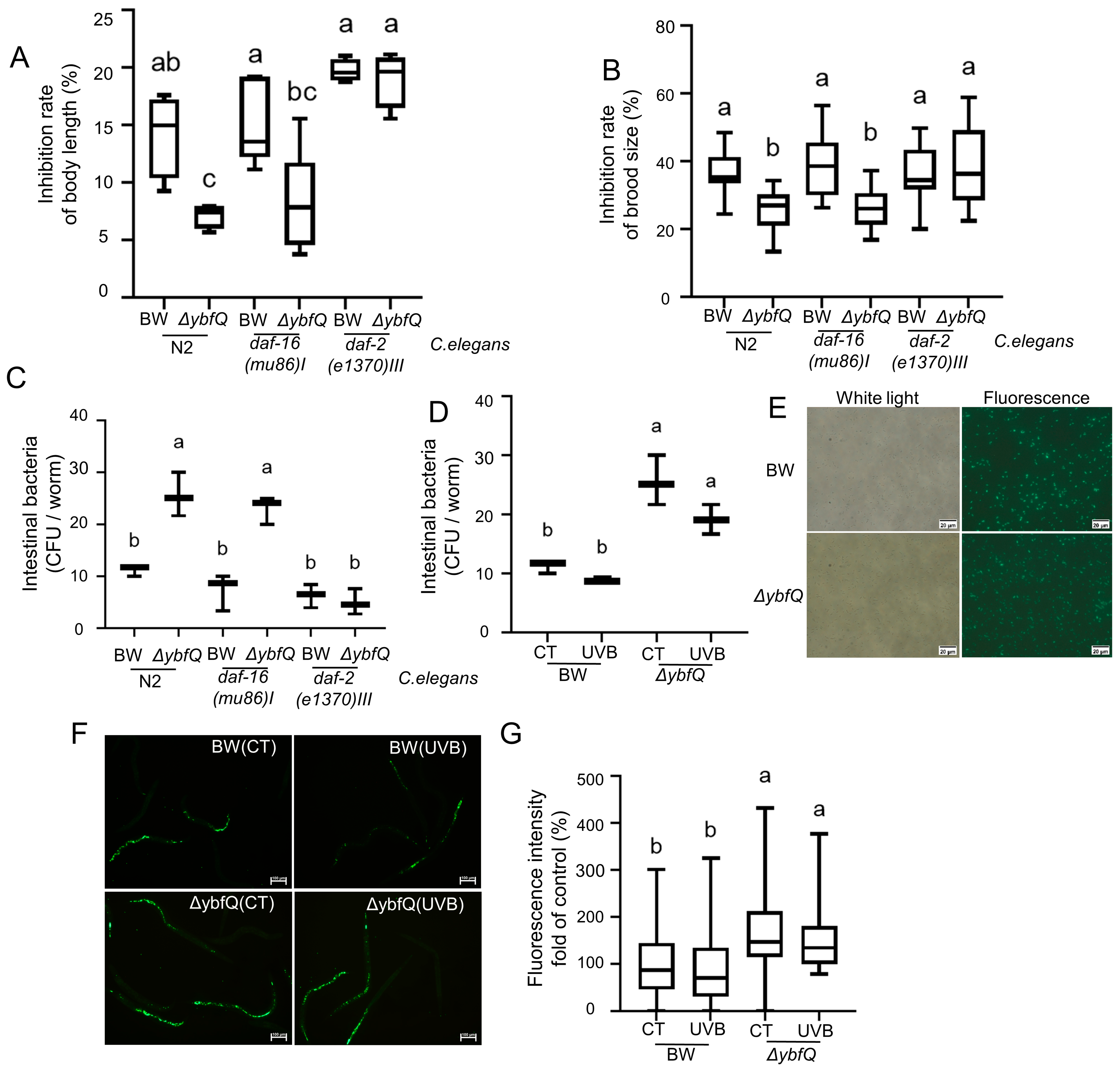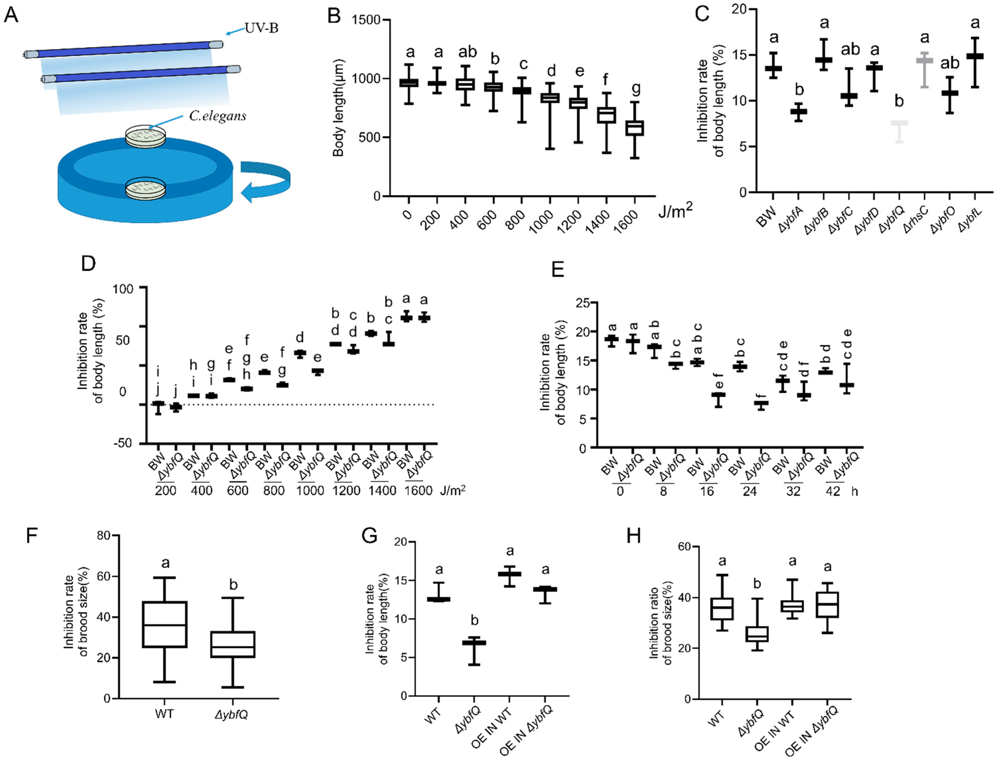Figure 1. Impact of the ybf genes mutation in Escherichia coli on radio-tolerance in Caenorhabditis elegans. (A) Schematic diagram of the UV-B irradiation setup; (B) Dose–response relationship between UV-B irradiation and worm growth inhibition (n = 5); (C) Effect of the ybf genes mutation on UV-B-induced growth inhibition (n = 3); (D) Dose–response relationship between BW25113 (BW) and ΔybfQ on worm growth inhibition (n = 3); (E) UV-B-induced growth inhibition at the indicated worm ages (n = 3); (F) Brood size of worms exposed to 800 J/m2 at age of 24 h (n = 5); (G) Effect of the expression of the wild-type ybfQ gene in ΔybfQ and BW25113 (BW) strains on UV-B-induced growth inhibition (n = 3); (H) Effect of the expression of the wild-type ybfQ gene in ΔybfQ and BW strains on worm brood size (n = 5). Significant differences (p < 0.05) among experimental groups are indicated with different letters.