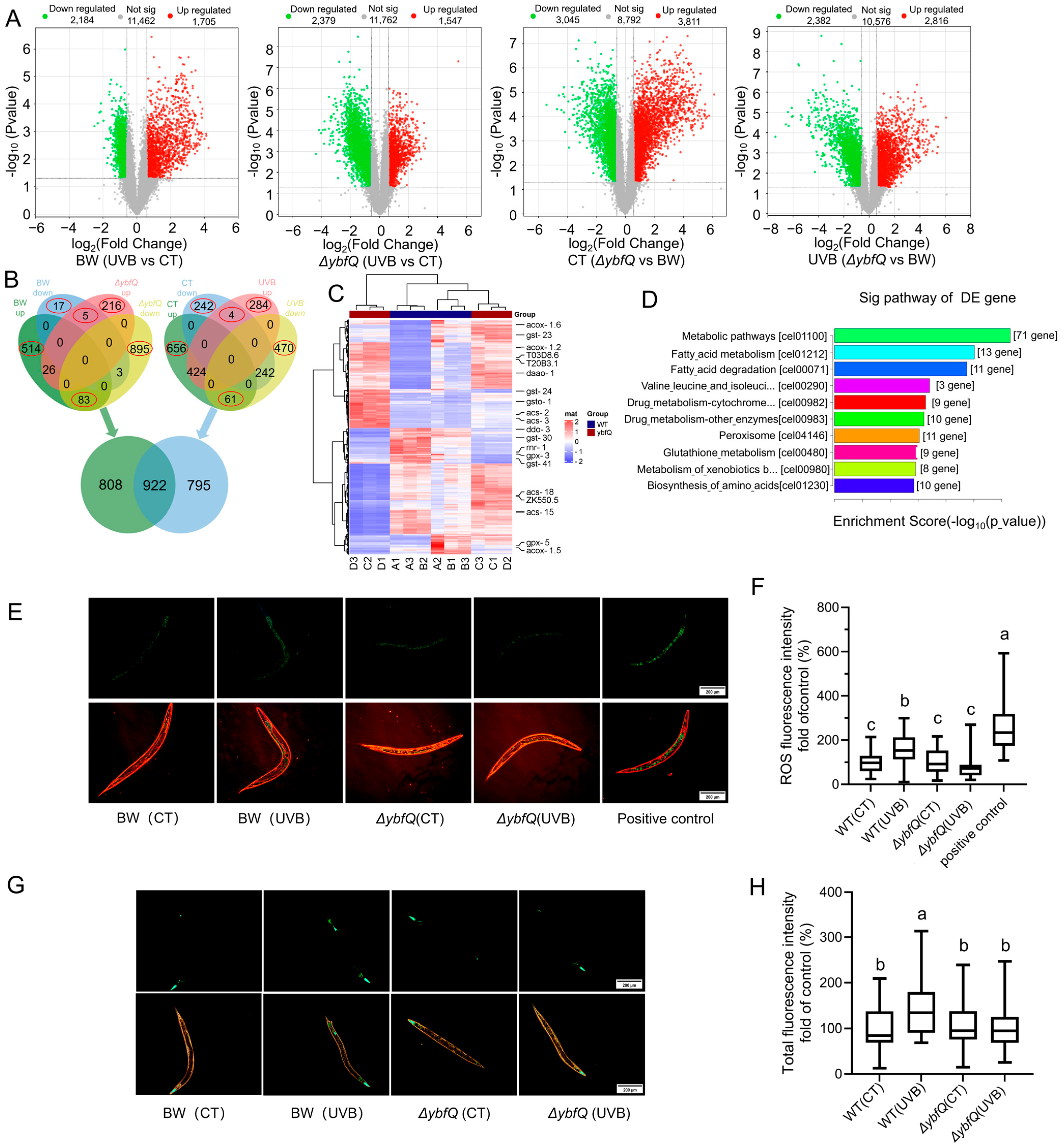 Figure 2. Transcriptome and oxidative stress in worms fed ΔybfQ bacteria. (A) Volcano plot illustrating differentially expressed genes between the indicated groups; (B) Venn diagram of differentially expressed genes. (C) Heat map of 2525 differentially expressed genes identified by Venn diagram analysis; (D) KEGG enrichment analysis of differentially expressed genes; (E,F) Quantification of ROS levels in worms using fluorescent probe DCFH-DA (n = 5); (G,H) Assessment of oxidative status in worms via the expression of the sod-3::gfp reporter gene (strain CF1533) (n = 5). BW stands for the BW25113 strain. Significant differences (p < 0.05) among experimental groups are indicated with different letters.
