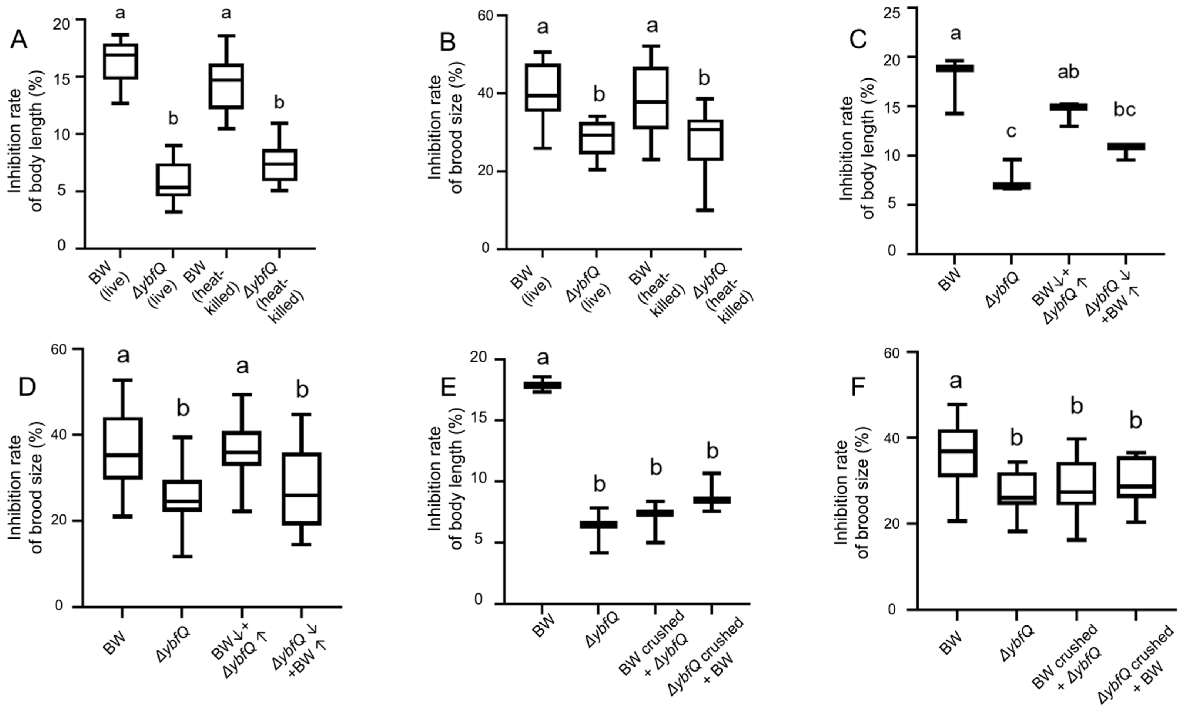 Figure 3. The role of ΔybfQ-derived metabolites in modulating radio-resistance in host worms. Effects of feeding heat-killed bacteria on radio-resistance, as measured by worm growth inhibition (A) (n = 6) and brood size (B) (n = 6); Effects of bacterial supernatant exchange on radio-resistance, as assessed by worm growth inhibition (C) (n = 3) and brood size (D) (n = 5); Effects of bacterial homogenate administration on radio-resistance, evaluated through worm growth inhibition (E) (n = 3) and brood size (F) (n = 5). BW stands for the BW25113 strain. Significant differences (p < 0.05) among experimental groups are indicated with different letters.