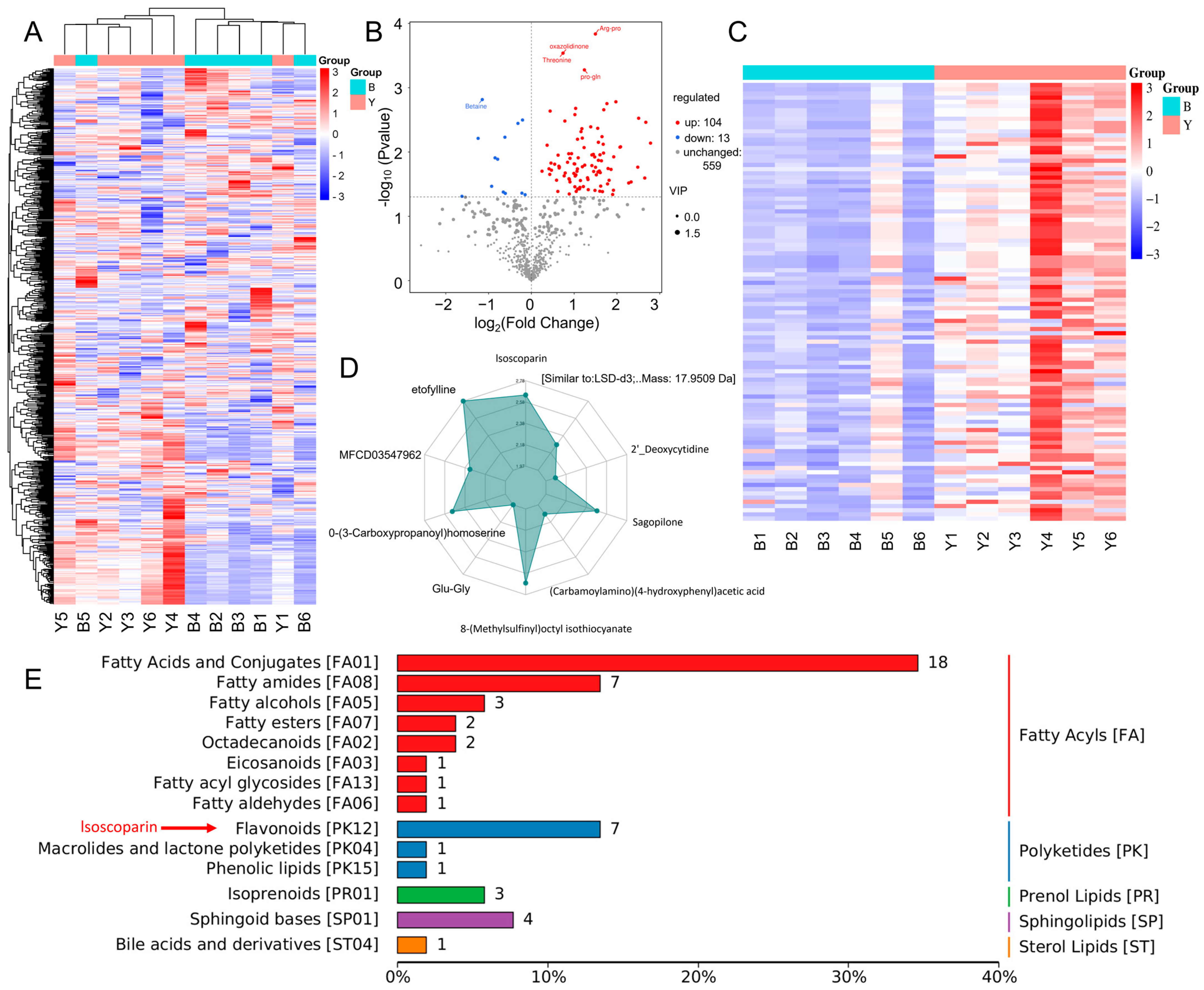Figure 4. Metabolome in ΔybfQ and BW25113 (BW) strains. (A) Heatmap illustrating the distribution of detected metabolites; (B) Volcano plot depicting the statistical significance and fold change of 676 metabolites; (C) Heatmap showing 104 metabolites with elevated levels in ΔybfQ; (D) The radar chart highlighting the top 10 metabolites with the largest absolute log2FC values; (E) Summary of the classification of these metabolites based on the LIPID MAPS database.