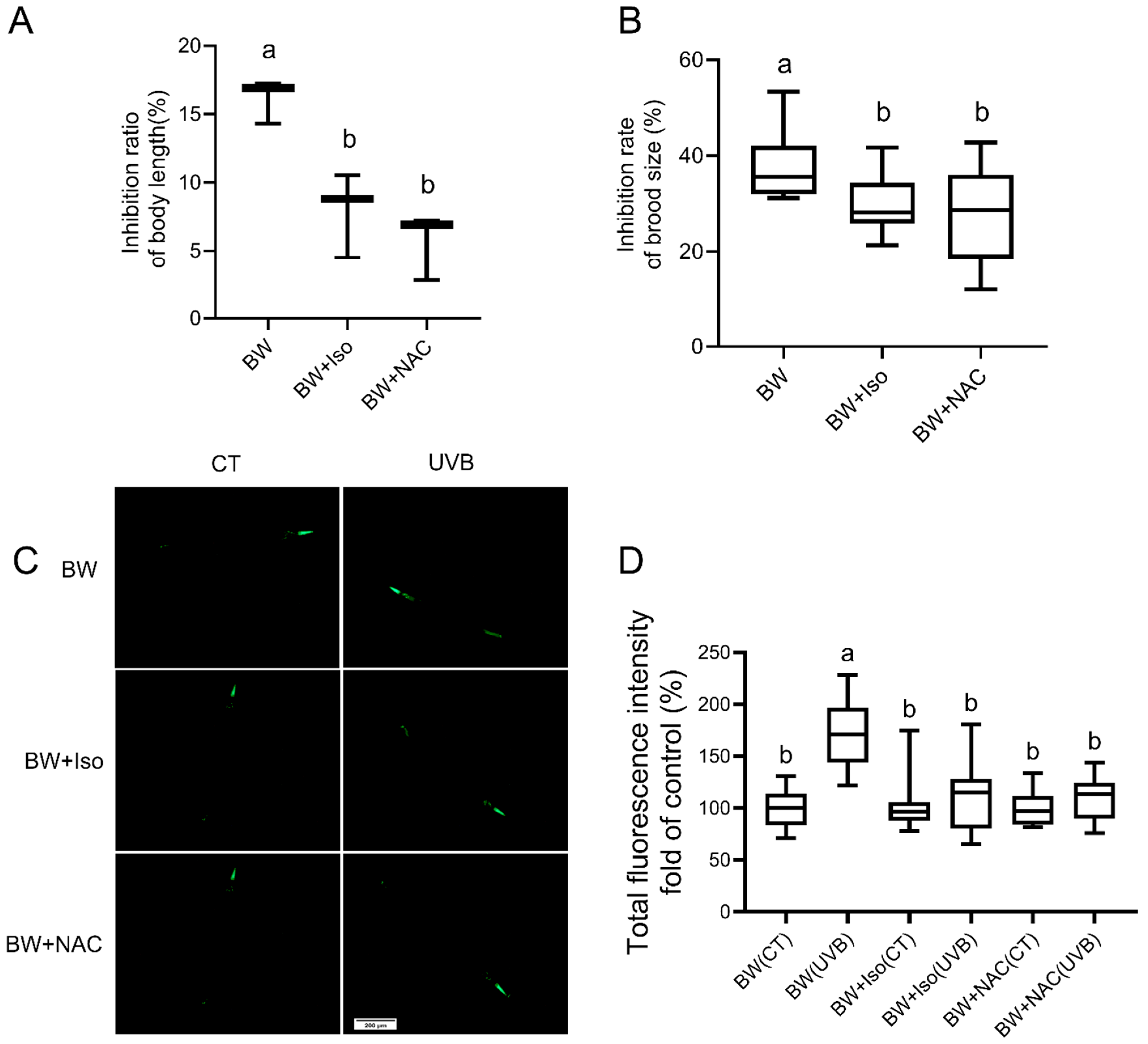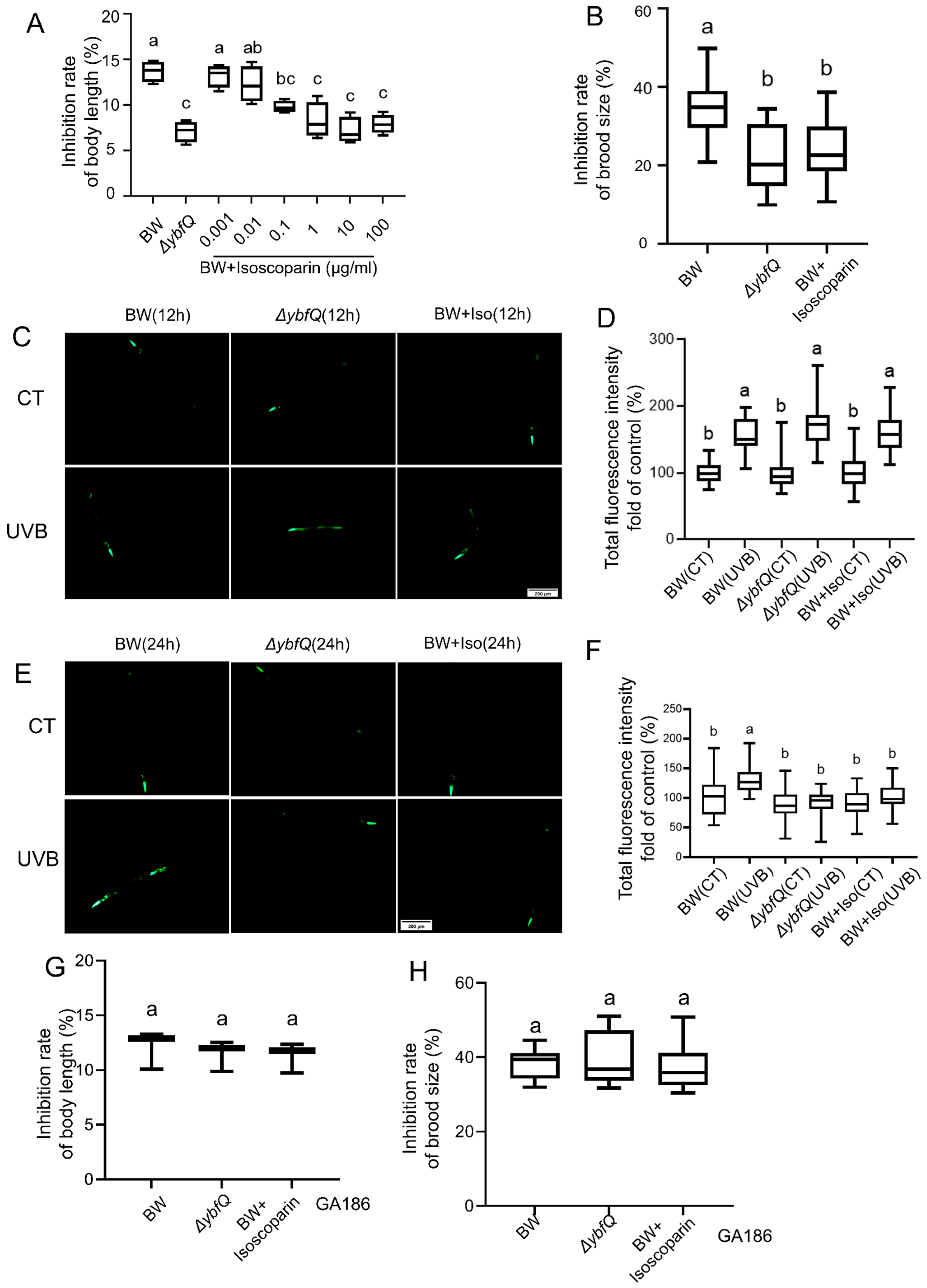 Figure 5. Role of isoscoparin in modulating worm radio-resistance. (A) Dose–response relationship between isoscoparin concentration and UV-B-induced inhibition of worm growth (n = 4); (B) Effect of isoscoparin (10 μg/mL) on worm brood size (n = 5); (C,D) Assessment of oxidative stress in worms 12 h after irradiation via expression level of the sod-3::gfp reporter gene (strain CF1533) (n = 6). (E,F) Assessment of oxidative stress in worms 24 h after irradiation via expression level of the sod-3::gfp reporter gene (strain CF1533) (n = 6). Effect of feeding ΔybfQ and isoscoparin treatment on radio-tolerance in sod-3 mutant worms, as measured by worm growth inhibition (G) (n = 3) and brood size (H) (n = 5). BW stands for the BW25113 strain. Significant differences (p < 0.05) among experimental groups are indicated with different letters.