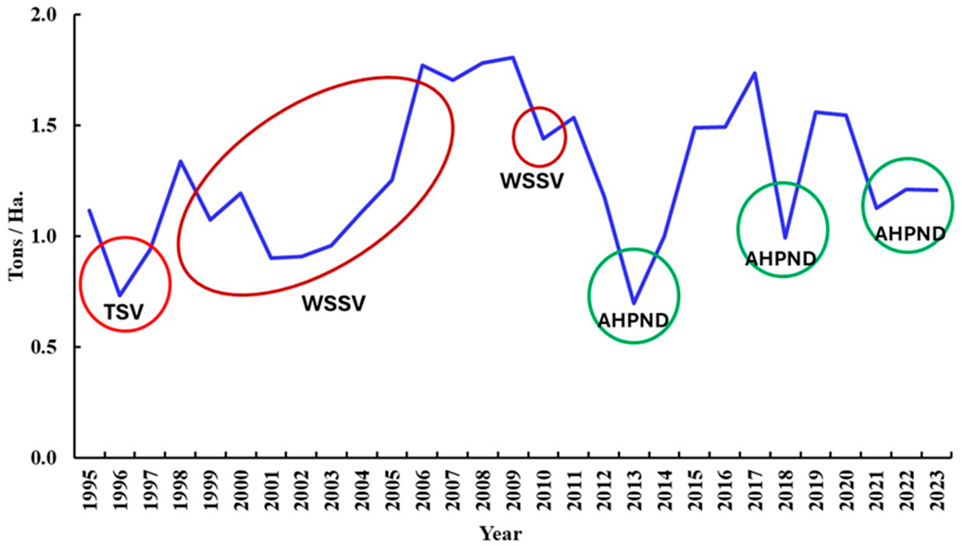 The intensification of shrimp farming has increased the number of stress factors, resulting in enhanced susceptibility to diseases [36,37,38]. Environmental stressors include variations in temperature or salinity due to heavy rain. Also, toxic substances in water from industrial or agricultural sources have been associated with the development of disease and mortality [39,40]. Intrinsic farming factors such as pond overcrowding, overfeeding, nutritional requirements not being met, and poor water quality have been involved in disease onset [41].