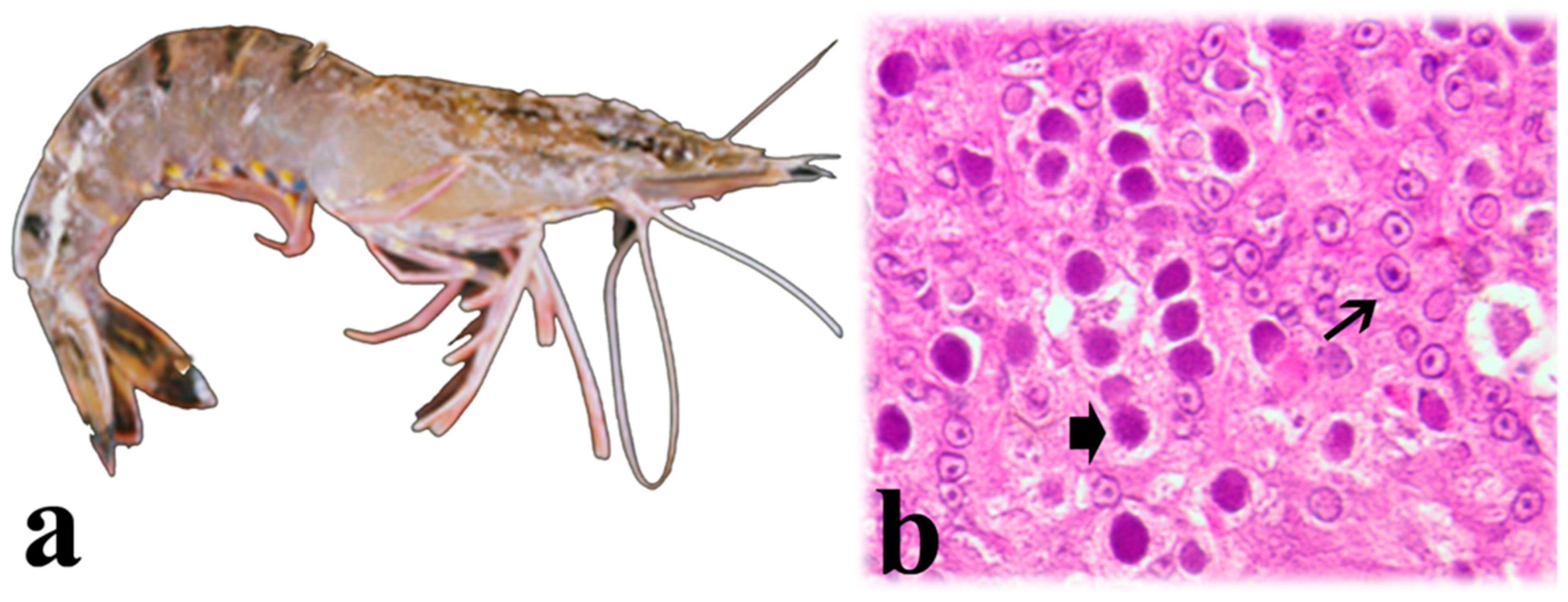 182. Nunan, L.M.; Pantoja, C.R.; Gómez-Jimenez, S.; Lightner, D.V. “Candidatus Hepatobacter penaei,” an intracellular pathogenic enteric bacterium in the hepatopancreas of the marine shrimp Penaeus vannamei (Crustacea: Decapoda). Appl. Environ. Microbiol. 2013, 79, 1407–1409. [Google Scholar] [CrossRef]