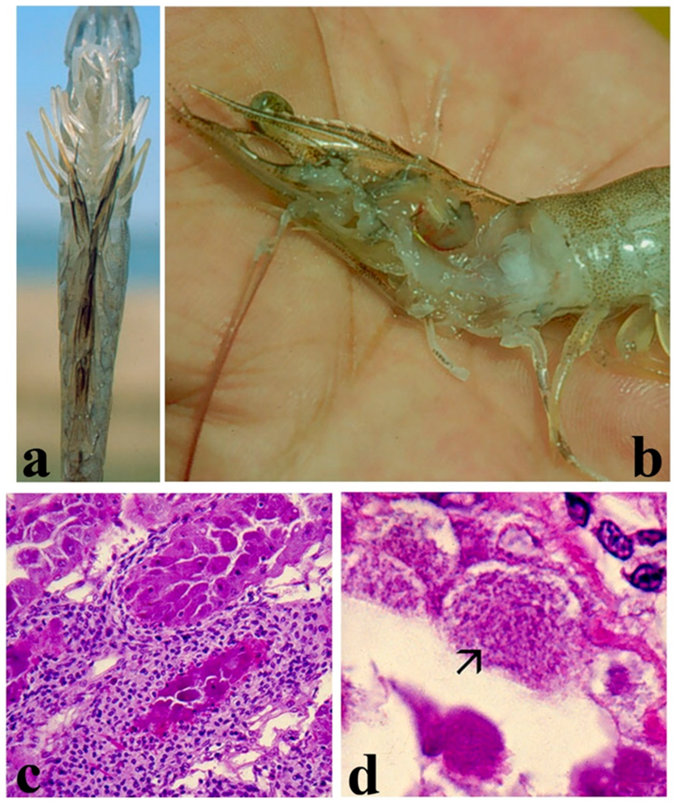 Figure 8. (a) Shrimp P. vannamei affected by necrotizing hepatopancreatitis (NHP). The edges and base of pleopods appear darkened due to melanization. (b) Juvenile P. vannamei affected by NHP. Hepatopancreas is reduced in size due to atrophy and appears whitish and soft. (c) Histopathological changes in hepatopancreas of juvenile P. vannamei with severe, subacute (grade 3–4) necrotizing hepatopancreatitis (NHP). Hemocytic infiltration, cytolysis, and sloughing of HP tubule epithelial cells are the main histological changes due to NHP (magnification 300×). (d) Epithelial cells of hepatopancreas showing no cytoplasmic lipid droplets; instead, they are filled with non-membrane-bound intracytoplasmic NHP bacteria (arrow) (magnification 1700×) (all images from AGDAF-NACA 2007) [60].