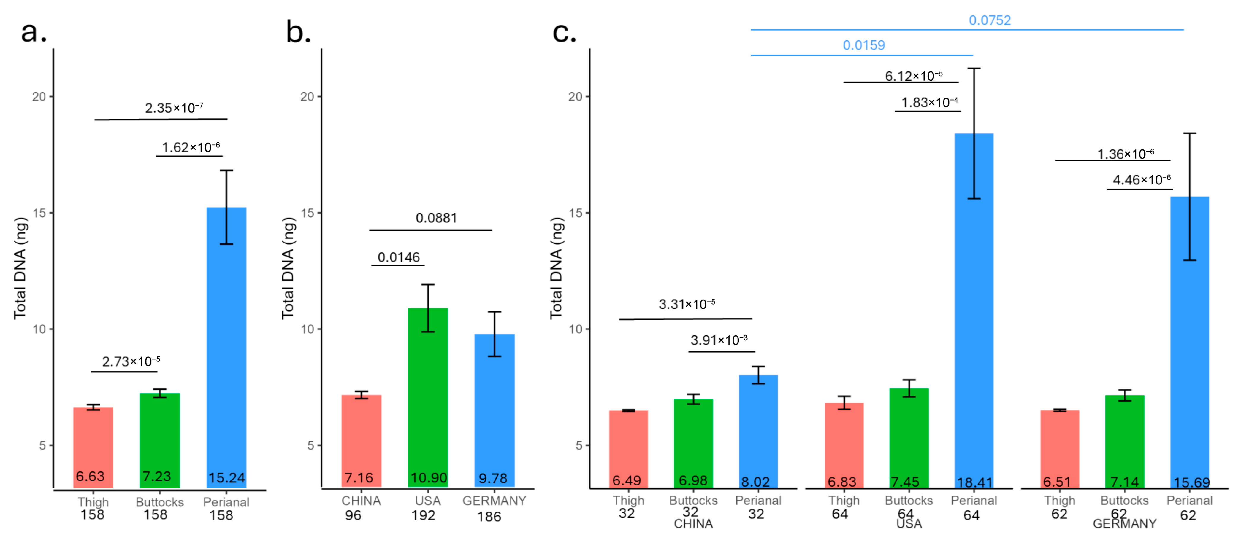 Figure 1. Average purified total DNA yield (ng) from 158 infant skin tape strips (158 buttocks, 158 perianal, and 158 thigh samples). (a) By anatomical site, (b) by geographic location, and (c) by site and geographic location. The average is displayed at the bottom of the bar while the number of samples per site is labeled on the x-axis. t-test p values were displayed if equal to or less than 0.1.