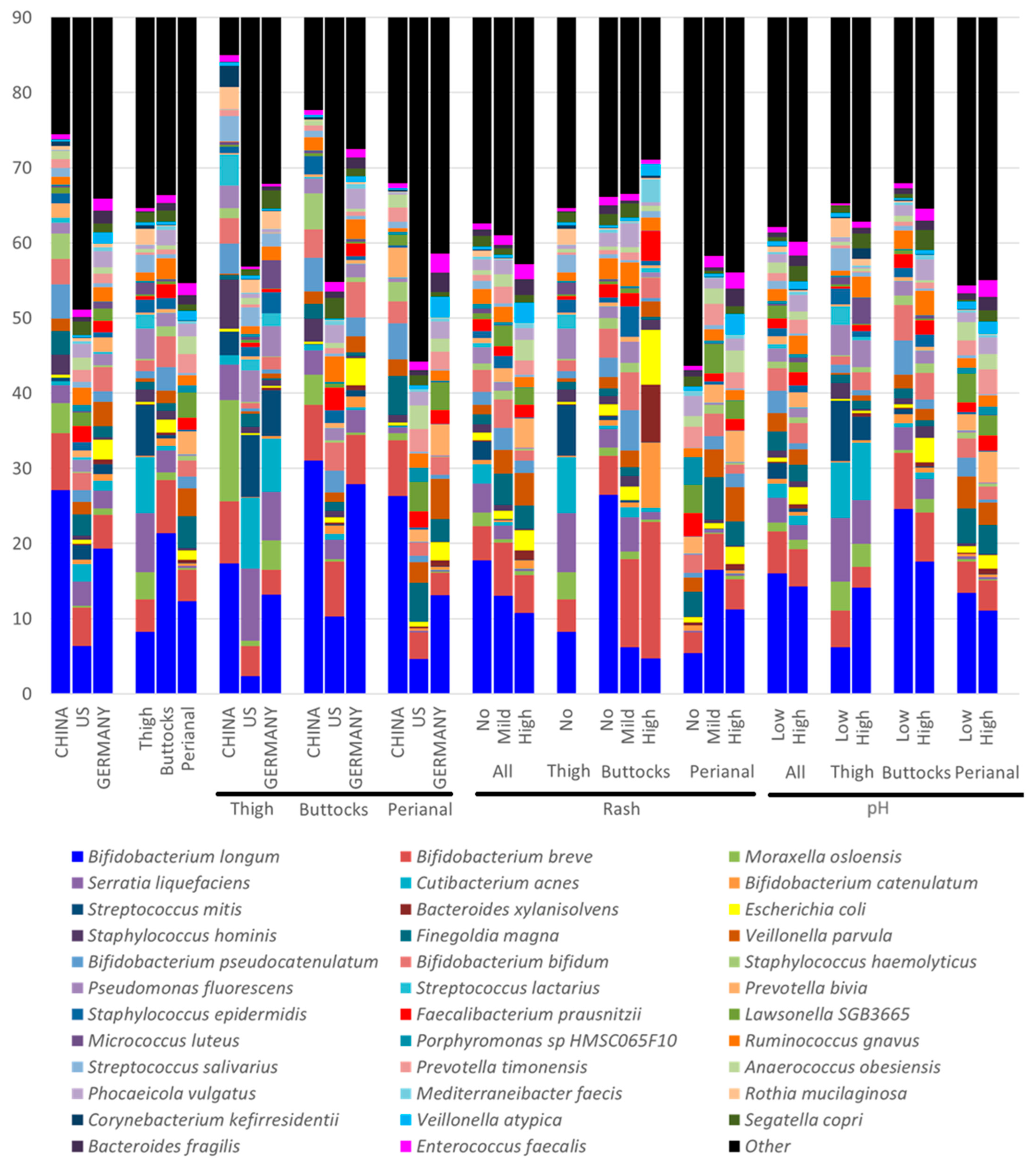 Figure 4. Composition of the infant skin microbiome from tape strips by anatomical sites, geographic locations, rash severity, and skin pH. Microbial species with a relative abundance of 2.5% or greater in any category were included.