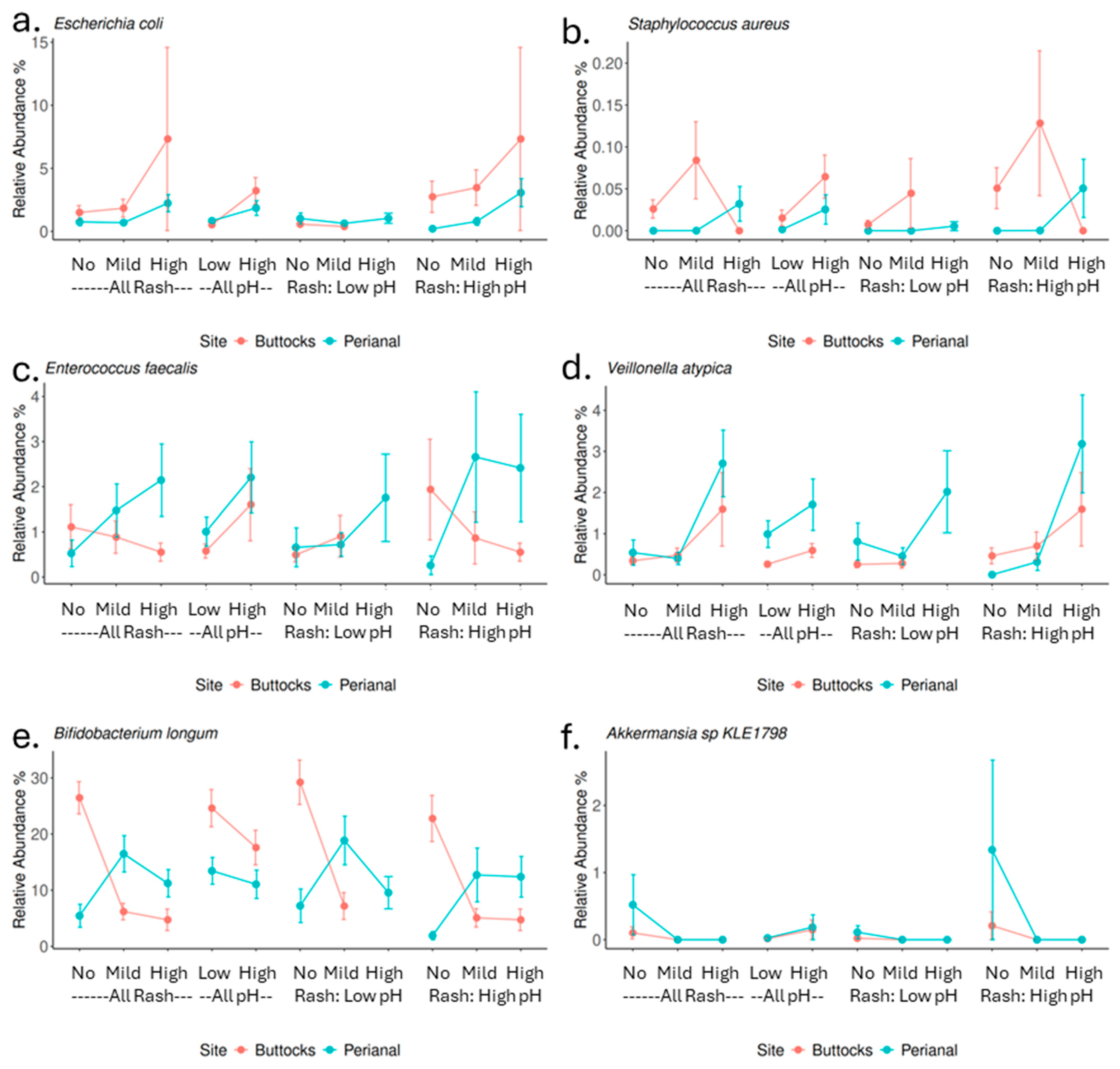 Figure 5. Selected microbial species and their associations with rash and pH in diapered areas (perianal and buttocks). The blue line indicates the relative abundance in perianal samples, while the red line represents the relative abundance in buttocks samples. The species depicted are as follows: (a) Escherichia coli, (b) Staphylococcus aureus, (c) Enterococcus faecalis, (d) Veillonella atypica, (e) Bifidobacterium longum, and (f) Akkermansia sp. KLE1798.