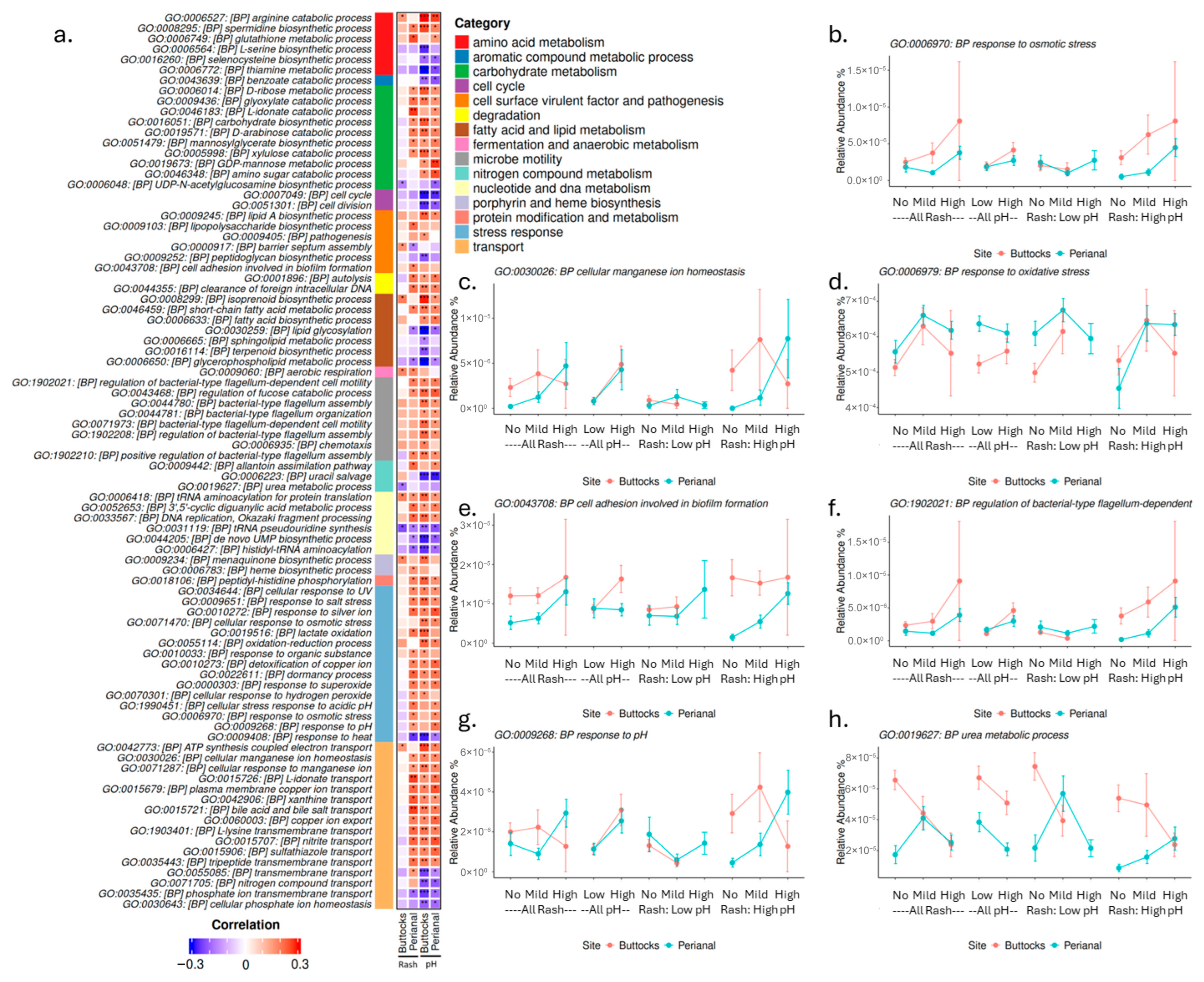 Figure 7. Microbial gene biological functions correlated with rash and pH. (a) Heatmap of selected microbial Gene Ontology (GO) terms showing Spearman correlations with skin pH or rash scores (p ≤ 0.05) in perianal and buttocks sites. The side color bar indicates the functional groups of these terms. Panel displays Spearman correlation coefficients with pH or rash scores (p ≤ 0.05) for both sites. (Significant level is labeled as: p ≤ 0.05: *, FDR ≤ 0.1: **, FDR ≤ 0.05: ***). The following functions are highlighted: (b) response to osmotic stress, (c) cellular manganese iron homeostasis, (d) response to oxidative stress, (e) cell adhesion involved in biofilm formation, (f) regulation of bacterial-type flagellum-dependent cell motility, (g) response to pH, and (h) urea metabolic process.