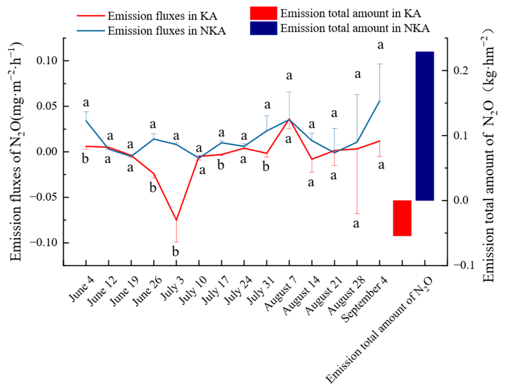 3.2. N2O Emission Fluxes and Cumulative Emissions in KA and NKA
