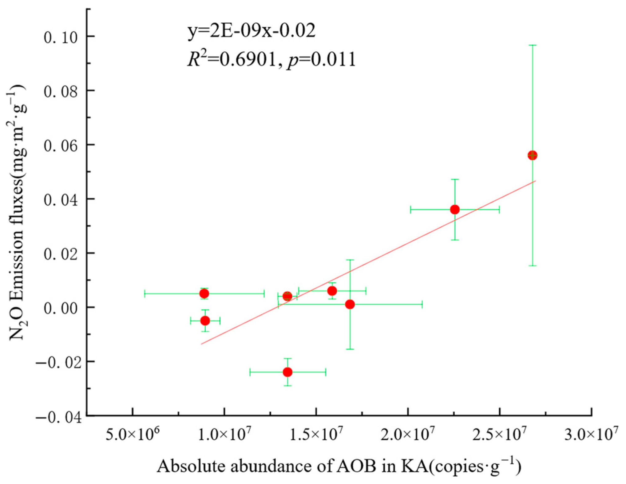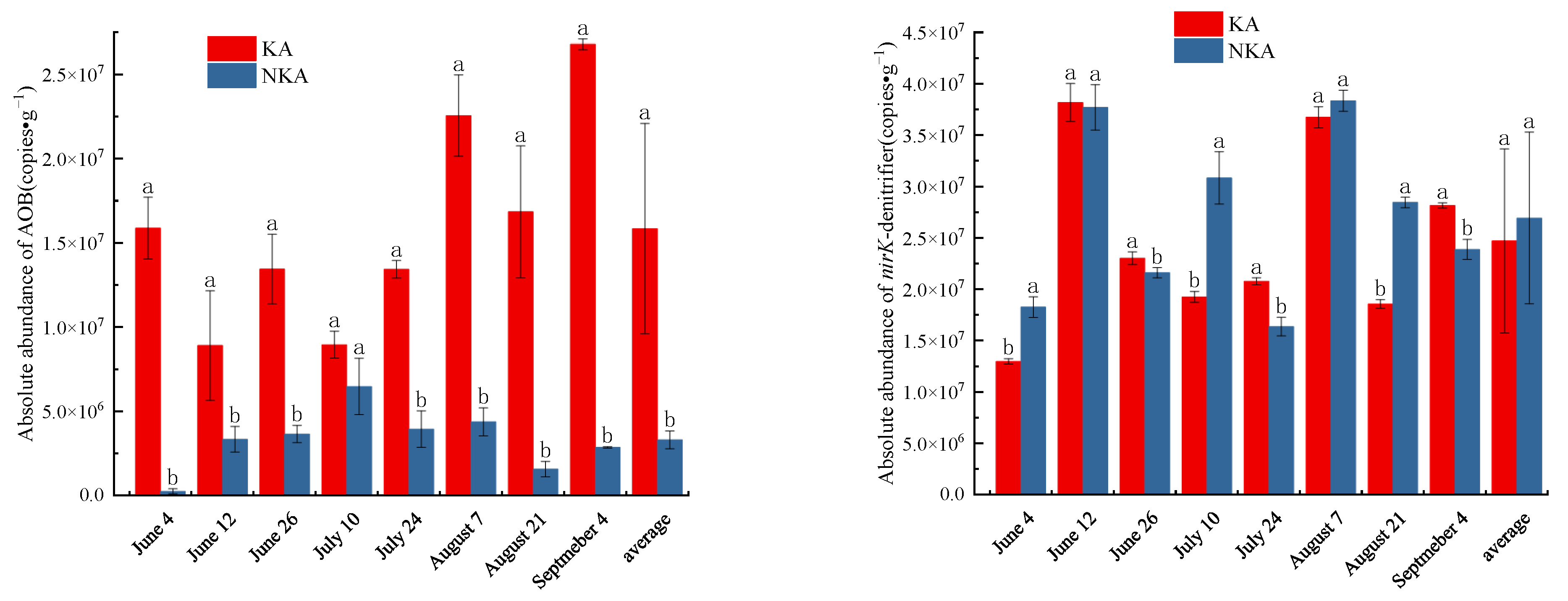 - The absolute abundance of AOB was significantly higher in KA than that in NKA, whereas the absolute abundance of nirK-denitrifier did not differ significantly between the two areas.