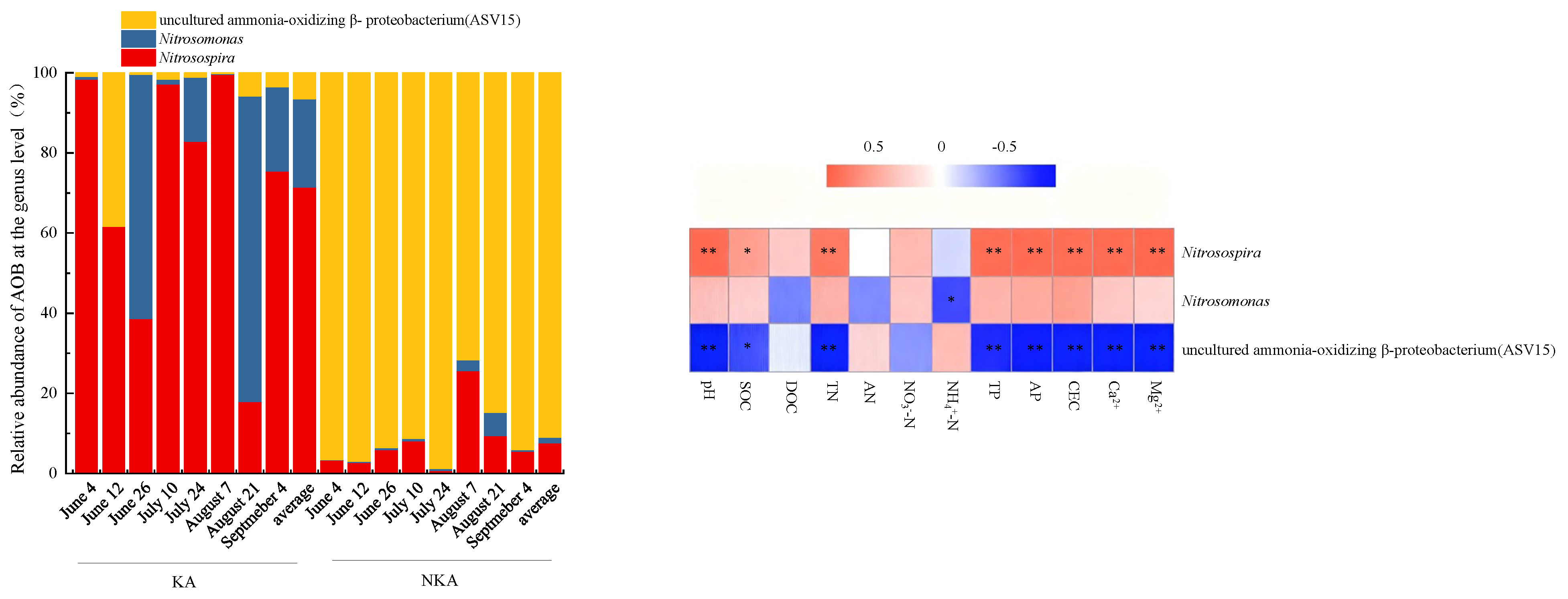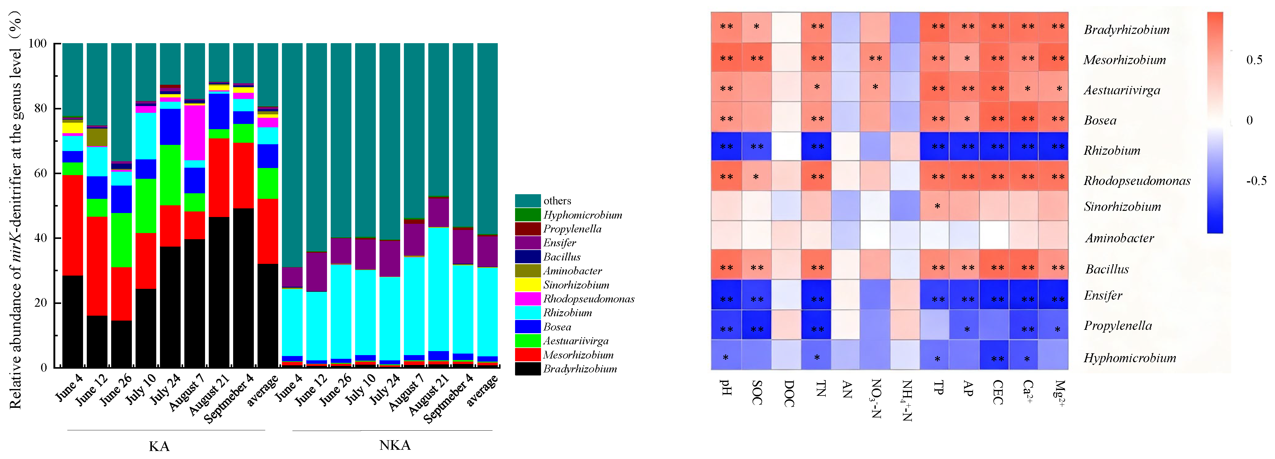 - The dominant AOB in KA were Nitrosospira and Nitrosomonas, while the dominant AOB in NKA was an uncultured ammonia-oxidizing β-proteobacterium. The dominant nirK-denitrifiers in KA were Bradyrhizobium, Mesorhizobium, Aestuariivirga, and Bosea, whereas Rhizobium and Ensifer were dominant in NKA.