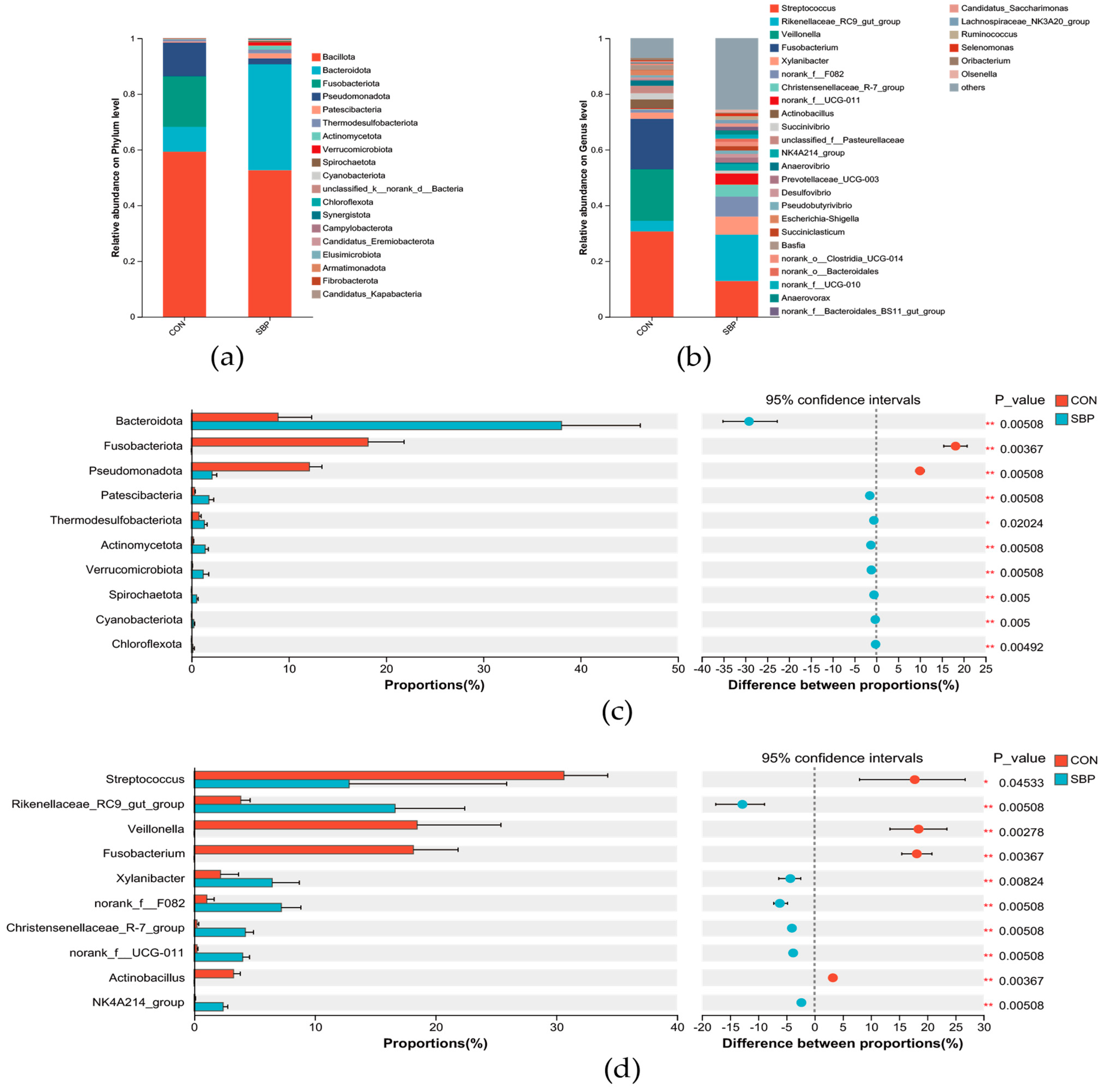 3.4. Effects of SBP on Rumen In Vitro Fermentation Bacterial Community Composition of Hu Sheep