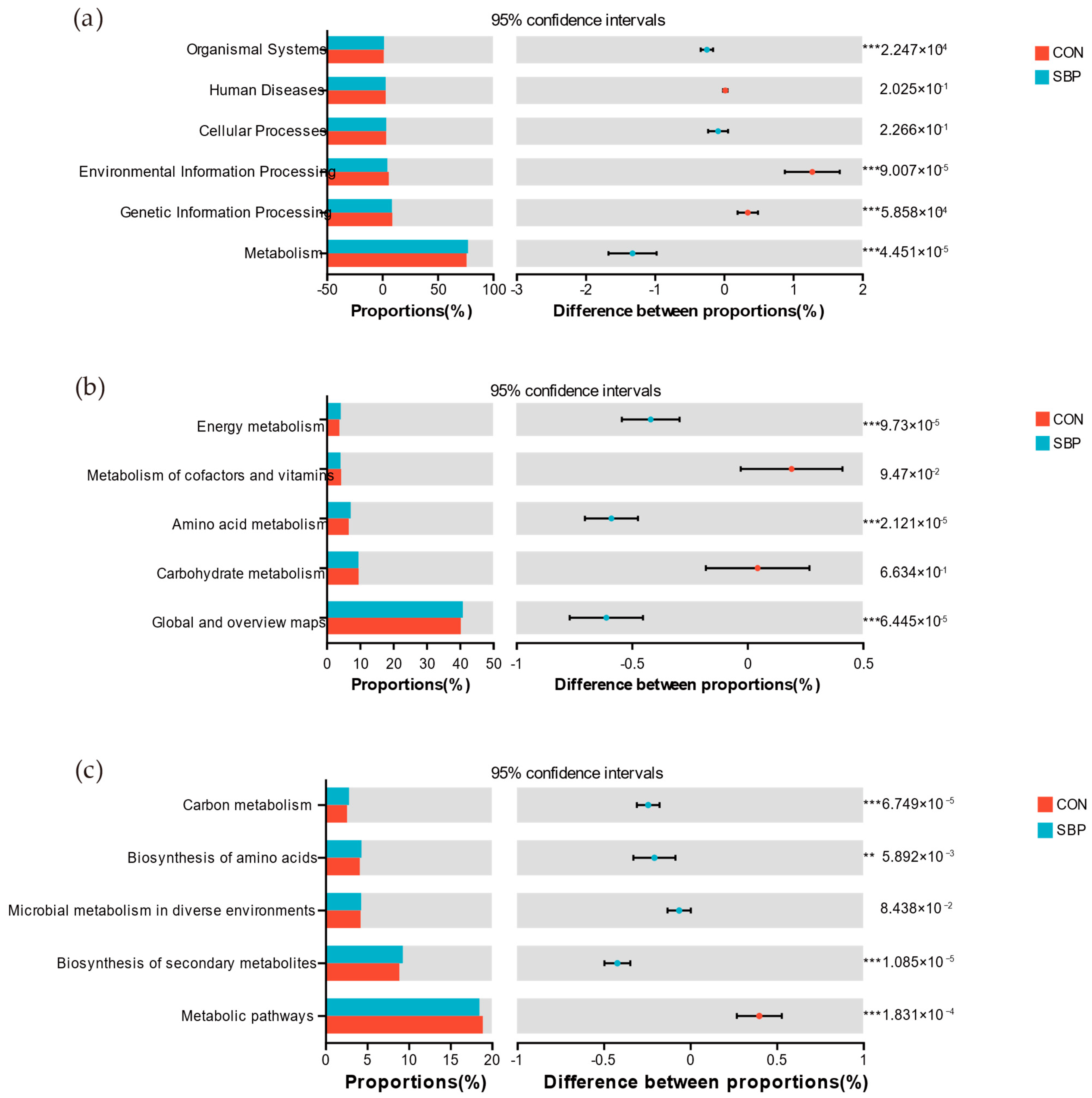 3.5. KEGG Functional Difference Analysis of Microbial Community