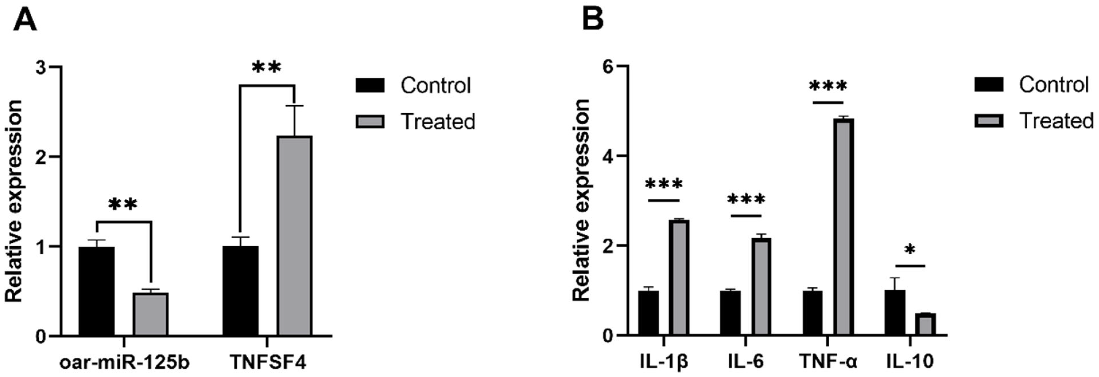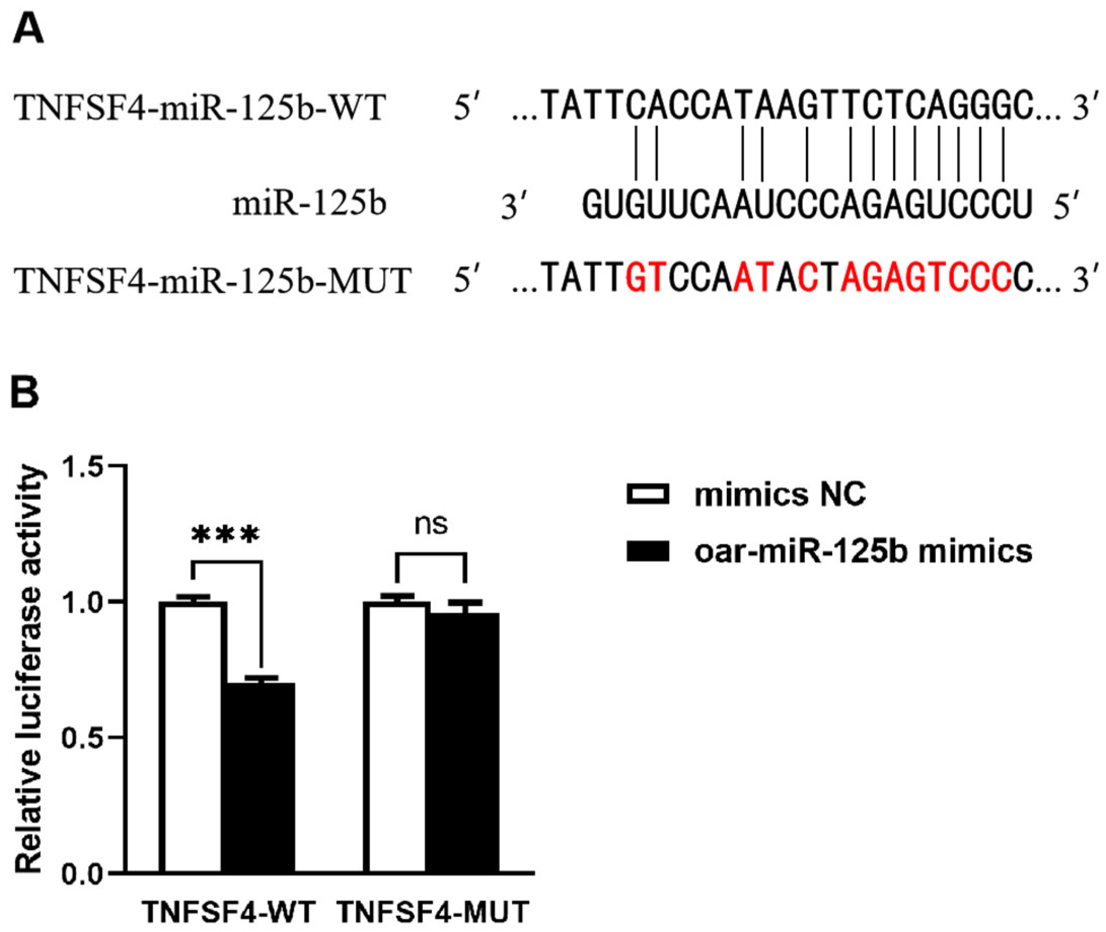 3.2. TNFSF4 Has Been Identified as a Direct Target of oar-miR-125b