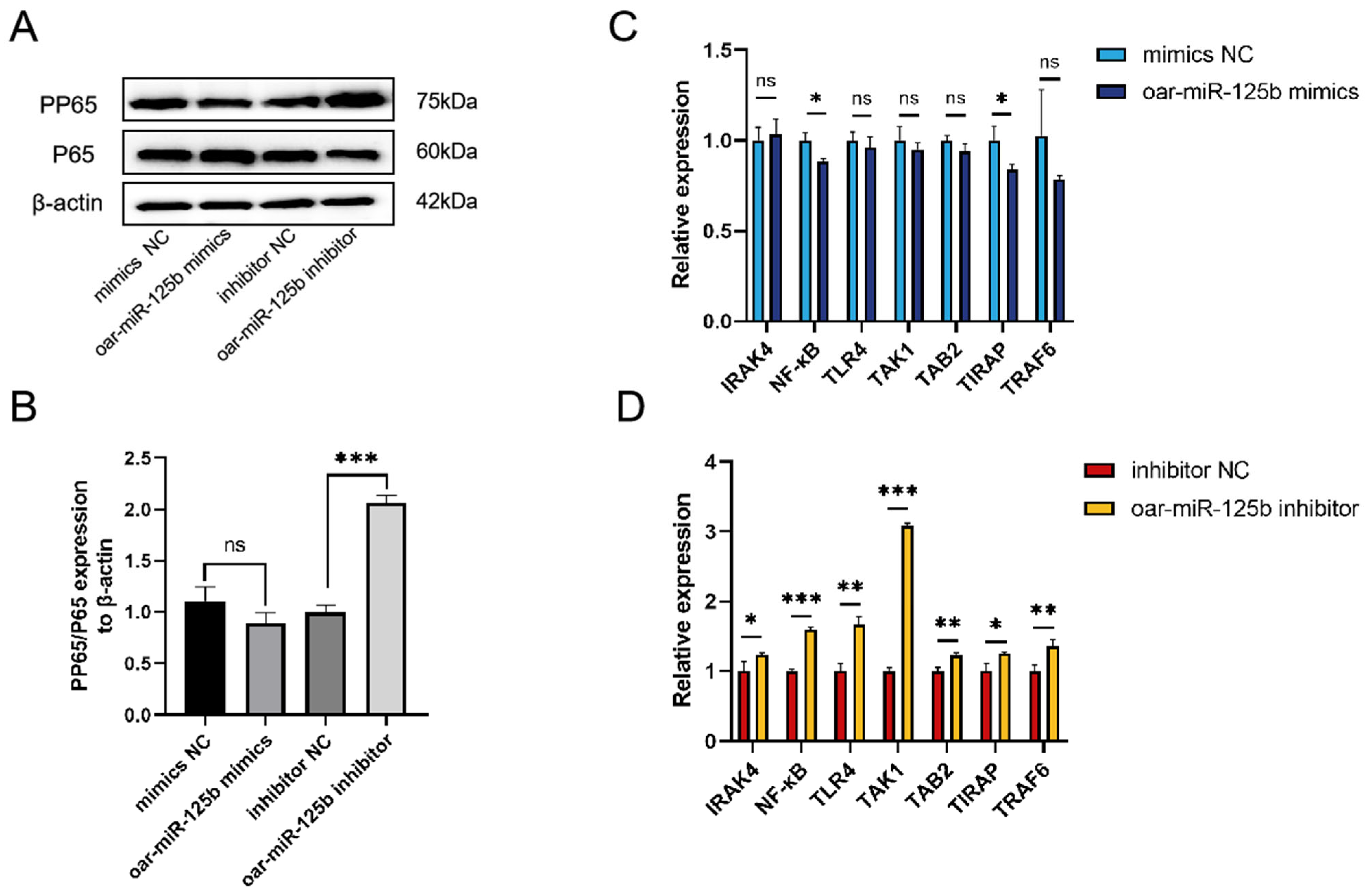 3.4. oar-miR-125b Negatively Regulates the NF-κB Pathway and Its Mediated Inflammatory Response by Targeting and Inhibiting TNFSF4