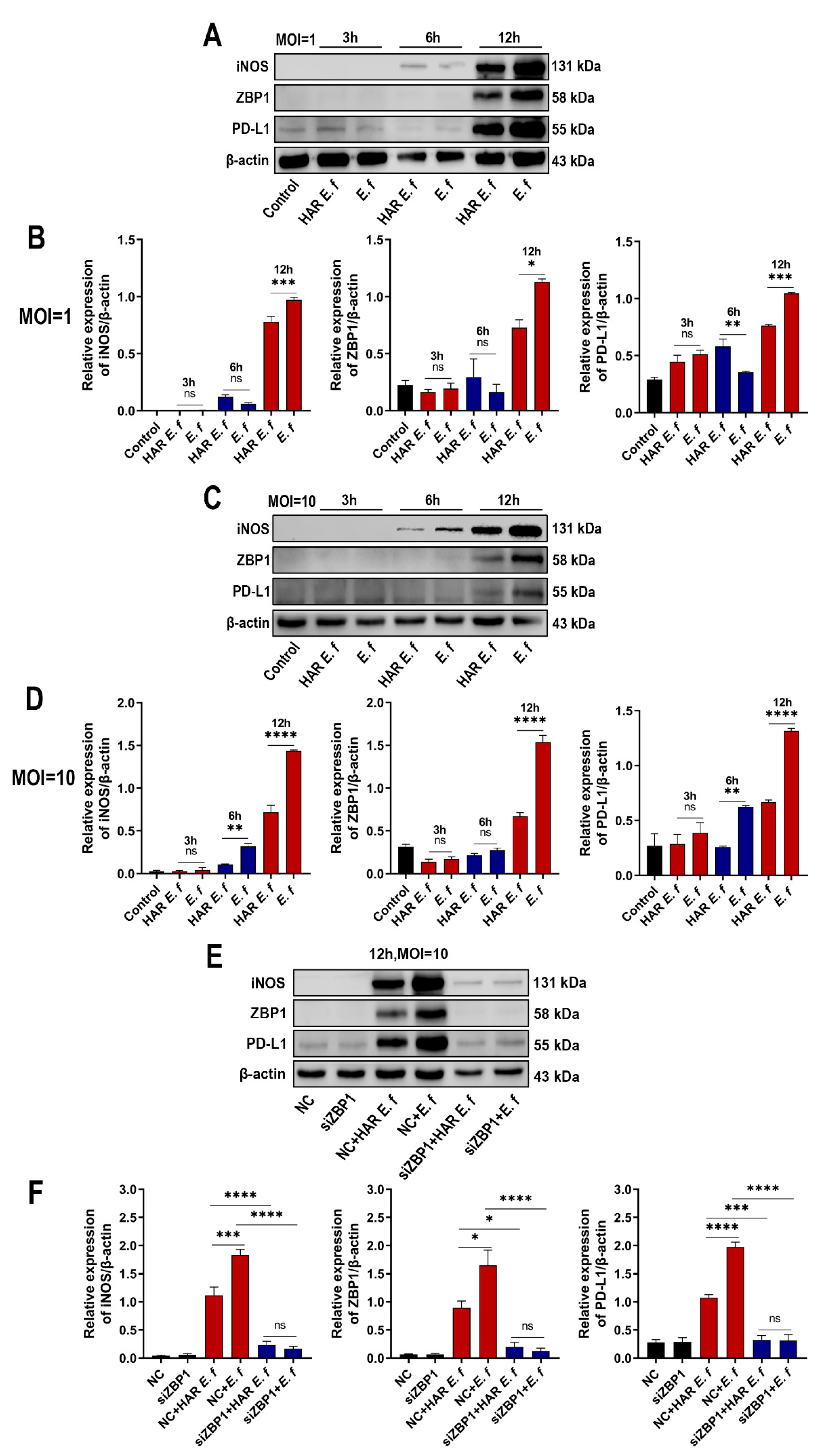 Figure 2. Macrophages stimulated with HAR E. faecalis showed compromised protein expression of iNOS and PD-L1 via ZBP1, relative to those stimulated with the standard strain. (AD) Protein levels of iNOS, ZBP1 and PD-L1 in RAW264.7 cells infected with HAR and standard E. faecalis (MOI = 1, 10) for 3 h, 6 h and 12 h. The quantitative data represent the relative ratio of the target protein to β-actin (Two-way ANOVA). (E,F) Protein levels of iNOS, ZBP1 and PD-L1 in RAW264.7 cells infected with HAR and standard E. faecalis (MOI = 10) for 12 h after ZBP1 knockdown (NC, negative control). The quantitative data represent the relative ratio of the target protein to β-actin (One-way ANOVA). Data are expressed as the mean ±SD (* p < 0.05; ** p < 0.01; *** p < 0.001; **** p < 0.0001; ns = no significant).