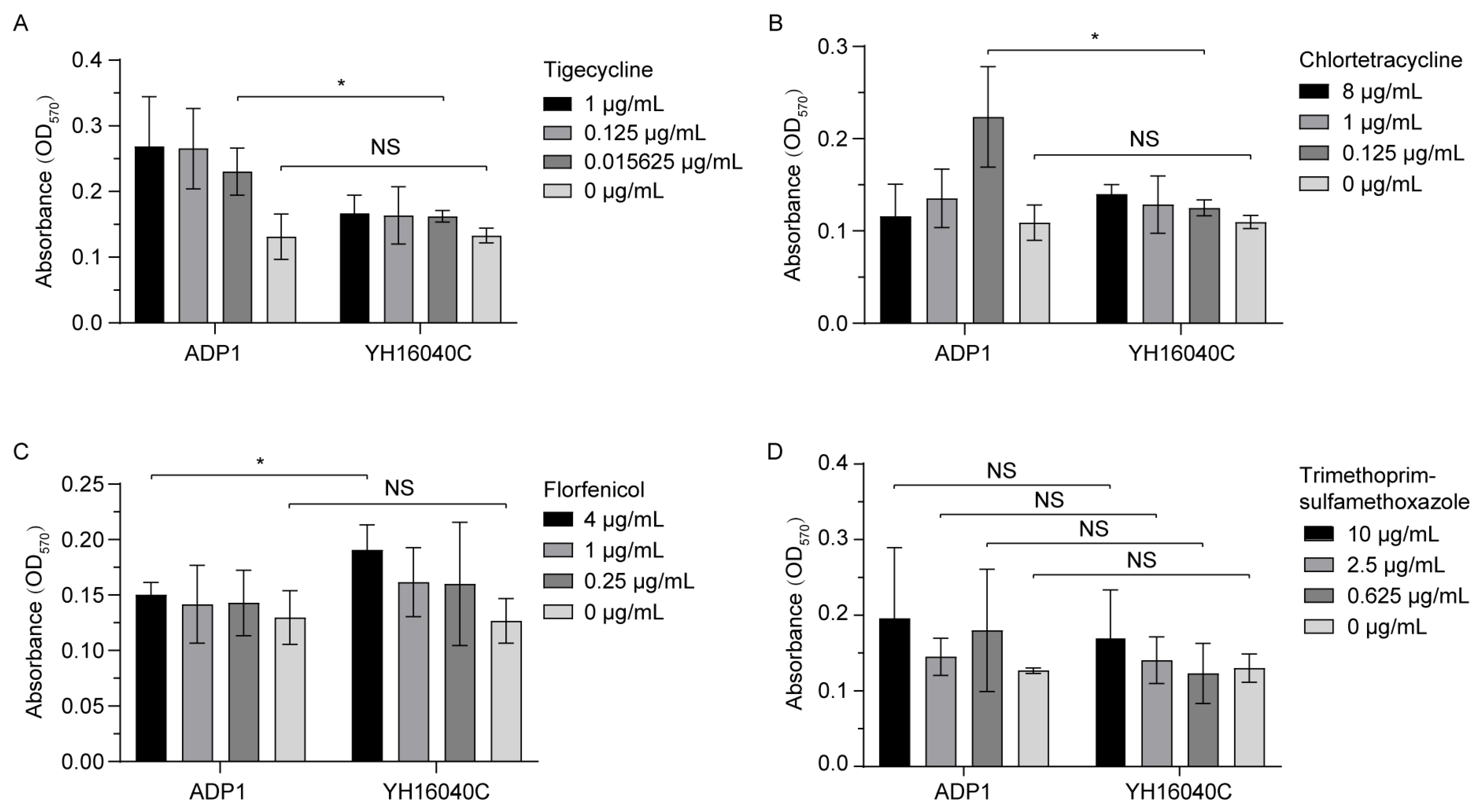 - Liu, C.; Liu, J.; Lu, Q.; Wang, P.; Zou, Q. The Mechanism of Tigecycline Resistance in Acinetobacter baumannii under Sub-Minimal Inhibitory Concentrations of Tigecycline. Int. J. Mol. Sci. 2024, 25, 1819. [Google Scholar] [CrossRef]