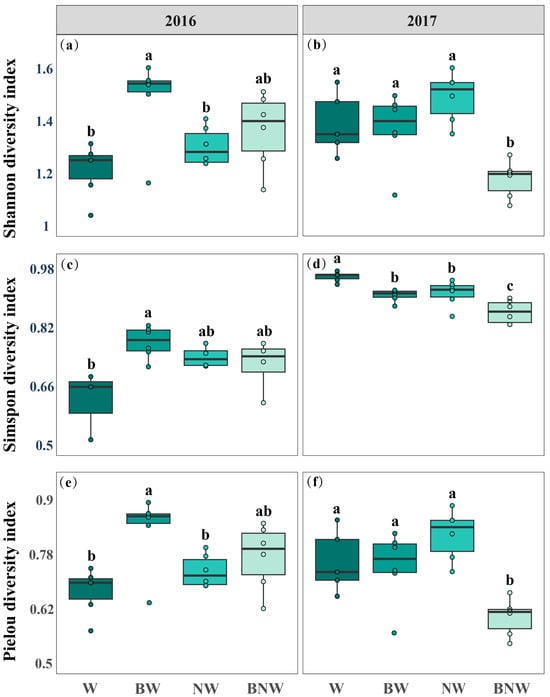 The effects of increased nitrogen deposition and AM fungi on plant community PLFA content in 2016 and 2017. All data are presented as “mean ± standard error”. Note: Different lowercase letters (a, b, c) indicate significant differences among treatments. (p < 0.05). W, water treatment; BW, benomyl + water treatment; NW, N + water treatment; BNW, benomyl + N + water treatment. (a) Shannon diversity under different treatments; (b) Plant density under different treatments; (c) Plant Evenness under different treatments; (d) Plant coverage under different treatments; (e) Plant richness under different treatments; (f) ANPP under different treatments. Results of the ANOVA are detailed in Supplementary Table S2.