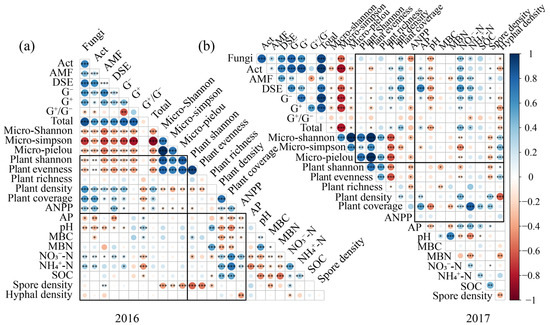 The correlation heatmap analysis revealed that there were tight and complex relationships among the soil physicochemical properties, soil microbial communities, and plant communities (Figure 4). For soil physicochemical properties, soil pH, NO3−-N and NH4+-N showed close relationships with soil microbial community and plant community (Figure 4). Soil pH showed significantly negative relationships with soil fungi, Act, and AM fungi, while soil NO3−-N and NH4+-N were significantly and positively correlated with soil fungi, Act, and G+ (Figure 4). Soil NO3−-N and NH4+-N exhibited significantly positive correlations with plant density and coverage, while soil pH and MBC showed significantly negative correlations with plant density and coverage (Figure 4). Furthermore, soil microorganisms showed close relationships with the plant community, particularly in 2016 (Figure 4). Soil fungi and Act showed significant and positive relationships with plant density, coverage, and ANPP, while soil Act and DSE showed significant and negative relationships with plant Shannon diversity and community evenness, which were more pronounced in 2016. The RDA results further confirmed that soil NO3−-N, NH4+-N, and AP showed significant effects on soil microorganisms (Figure S4a,b). Soil pH, NO3−-N, NH4+-N, and SOC exhibited significant influences on plant community (Figure S4c,d). And, soil fungi and AM fungi were the top two factors influencing plant community (Figure S4e,f).