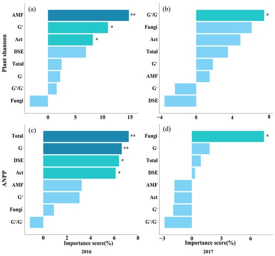 Contribution of soil microbial communities to plant community Shannon diversity and ANPP in 2016 (a,c) and 2017 (b,d) based on random forest analysis. Statistical significance was defined as follows: * p < 0.05 was considered significant, ** p < 0.01 was considered highly significant.