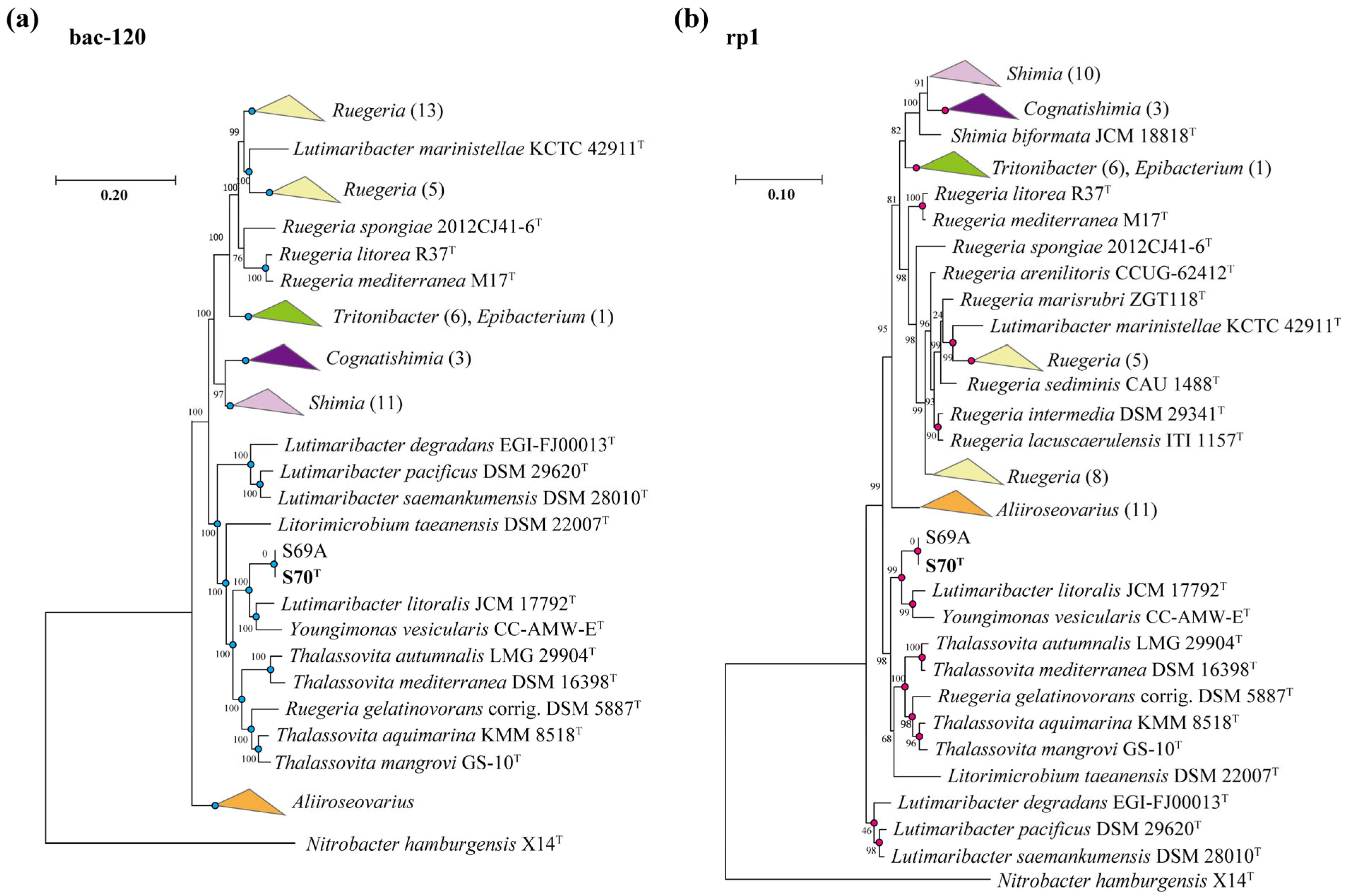 - Yoon, J.; Kang, S.; Lee, J.; Oh, T. Lutimaribacter saemankumensis gen. nov., sp. nov., isolated from a tidal flat of the Yellow Sea. Int. J. Syst. Evol. Microbiol. 2009, 59, 48–52. [Google Scholar] [CrossRef][Green Version]