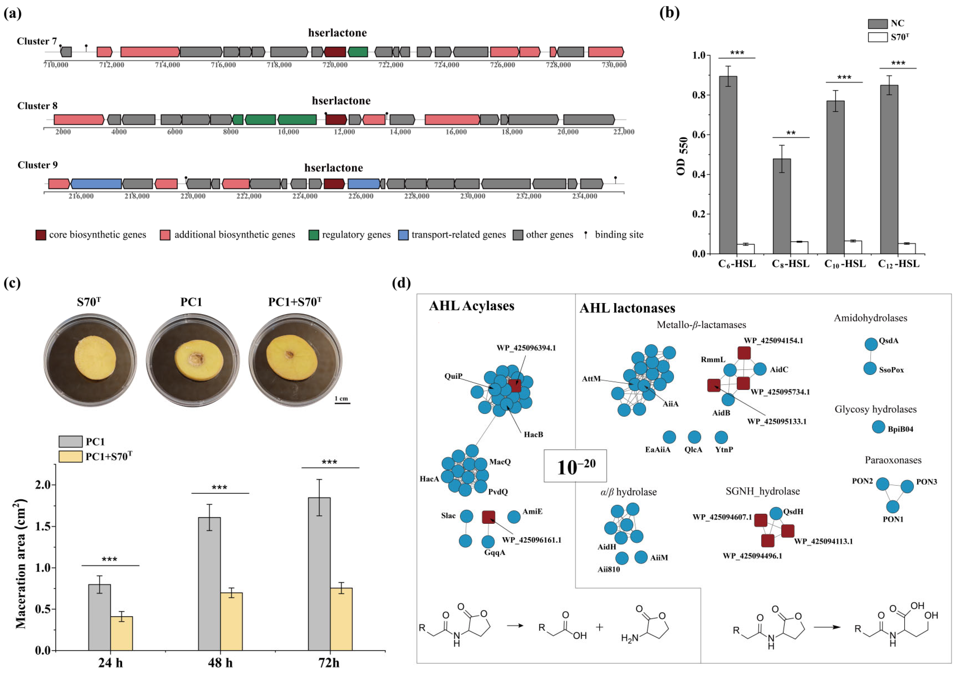 3.6. Quorum Quenching Capacity of Strain S70T