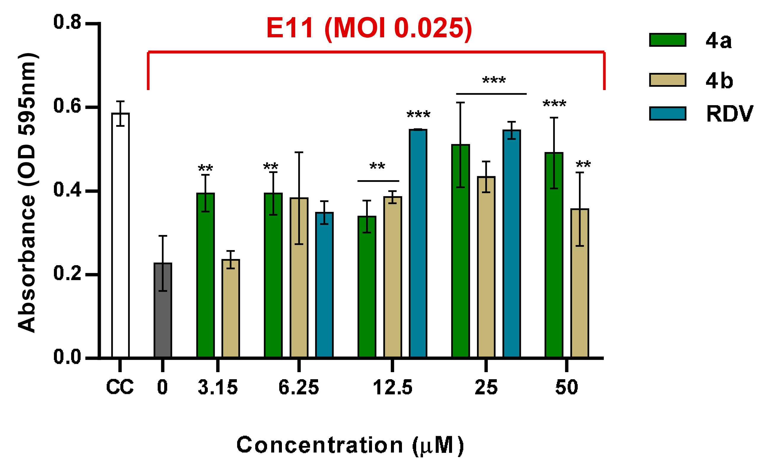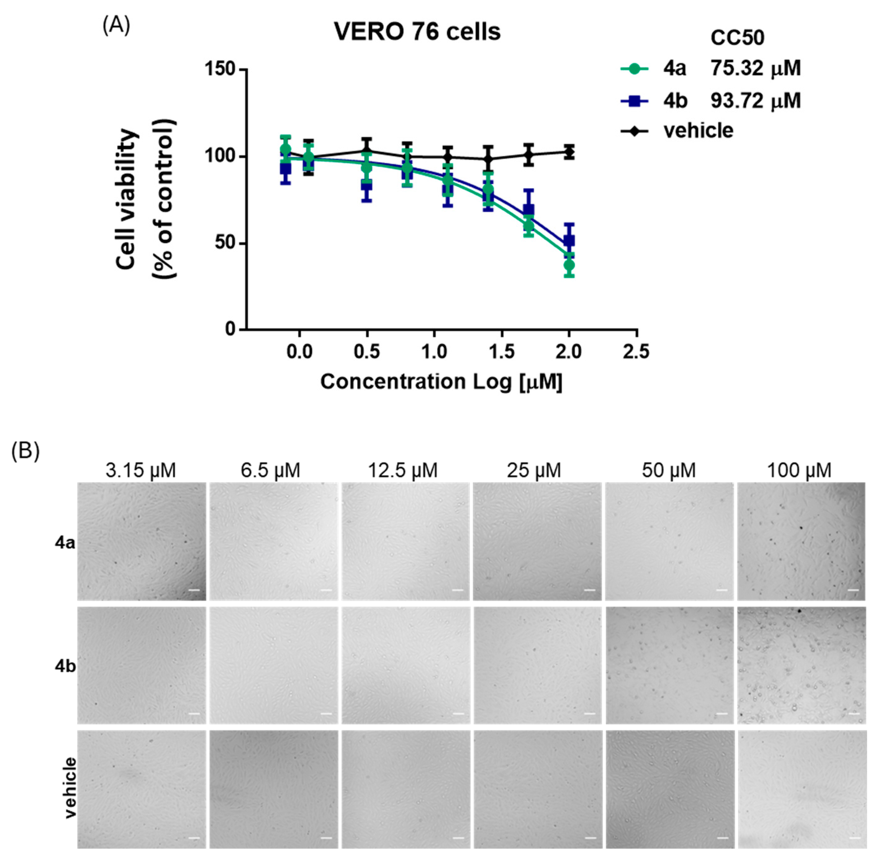 A co-treatment assay was performed as a screening test to determine the antiviral activity of 4a and 4b as anti-E11 agents. Each compound was added to the cell monolayer (3.2–100 μM) at the same time as viral infection for 48 h at 37 °C.