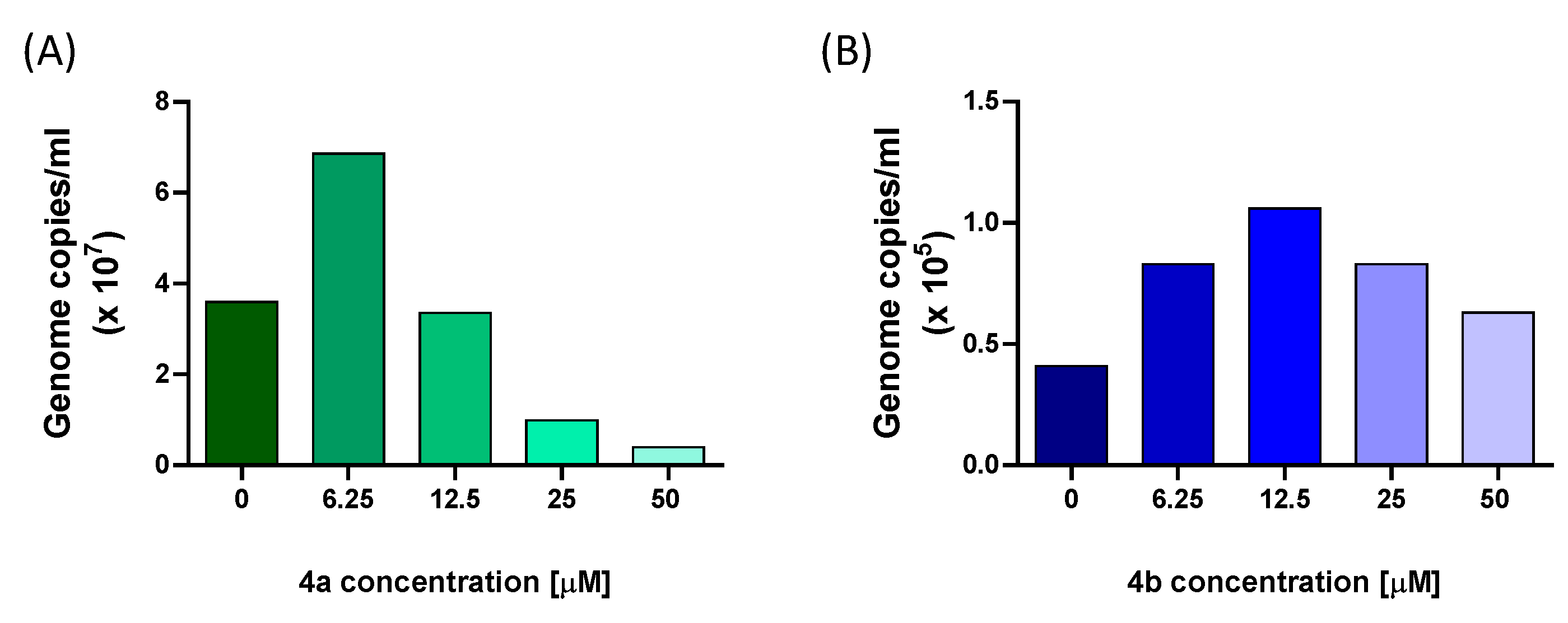 In parallel with the antiviral evaluation, the cytotoxic potential of the compounds was assessed using the MTS assay. The analysis confirmed a dose-dependent reduction in cell viability, with CC50 values of 75.3 ± 10.6 µM for 4a and 93.7 ± 19.2 µM for 4b. Compound 4a maintained a cell viability above 80% up to 25 µM, whereas for compound 4b a modest reduction (~77%) was already observed at the same concentration. Microscopic inspection corroborated these data, showing no appreciable morphological alterations under these conditions. Overall, the pronounced antiviral effects of 4a at sub-cytotoxic concentrations clearly outweighed the modest impact on cell viability, highlighting its favorable selectivity profile. By contrast, the narrower therapeutic window of 4b, combined with its weaker antiviral activity, further supports 4a as a more promising candidate for subsequent investigations.