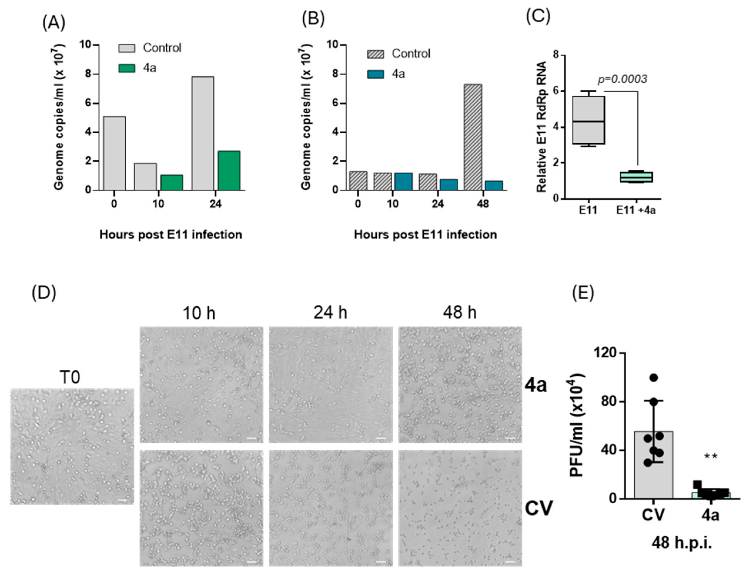 4a could act by inhibiting the RNA-dependent RNA polymerase (RdRp), which is translated and becomes active in enteroviruses no earlier than 3–4 h post-infection, in this study we focused our kinetic analysis on timepoints from 10 h onwards. Earlier phases, such as viral adsorption, uncoating, and initial translation of the viral polyprotein, occur within the first 1–2 h p.i. and are not directly targeted by RdRp inhibitors. Nevertheless, future experiments including intermediate timepoints such as 6 h p.i. may help to define the onset of antiviral activity with greater temporal resolution.