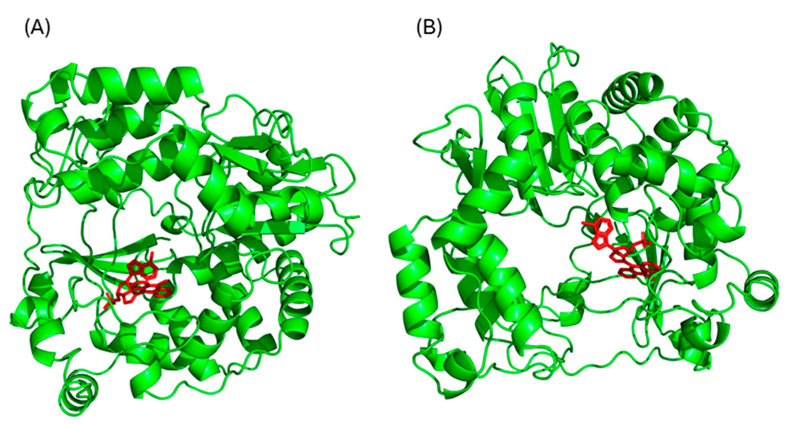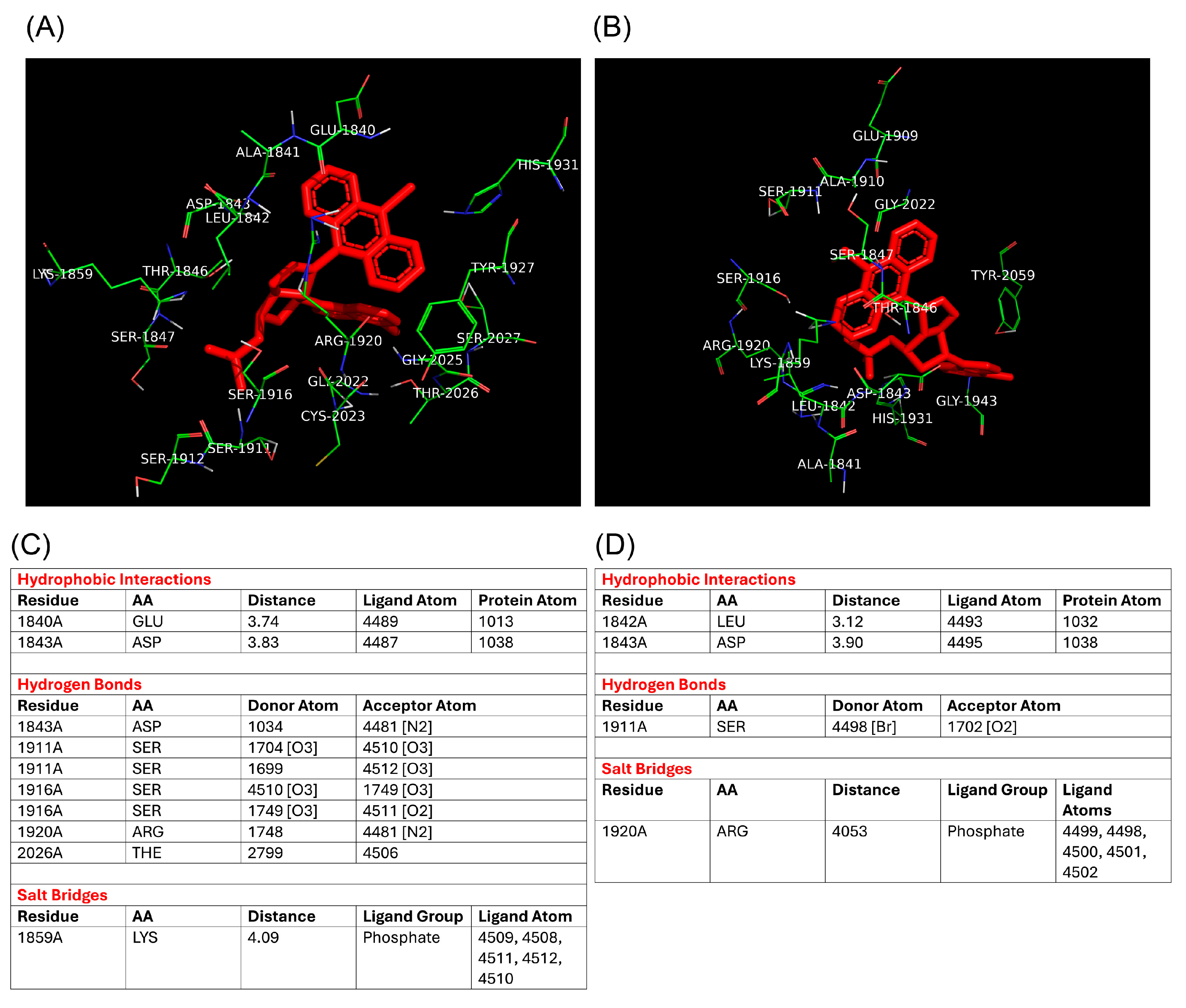 Molecular docking studies were performed using the AutoDockTools 1.5.7 software (Scripps Research Institute, MGLTools, version 1.5.7; La Jolla, CA, USA), with which initially all small molecules, such as water, salts, and ligands, were removed. The docking protocol using AutoDockTools (Scripps Research Institute, MGLTools, version 1.5.7; La Jolla, CA, USA) was constructed using a box with dimensions of 15 × 15 × 15 Å, centered on coordinates [60.8, 44.7, 58.8] with a grid spacing of 1 Å, using the default settings of the Lamarckian genetic algorithm. To best center the grid box, the coordinates of the complex ligand were extrapolated from the crystallographic structure of 4Y2A and were used for our analysis. The protein–ligand interactions were analyzed and visualized using the Pymol (version 2.6, Schrödinger, Portland, OR) and BIOVIA Discovery Studio 2024 ( version 24.1.0.23298, Dassault Systèmes, San Diego, CA, USA) software.