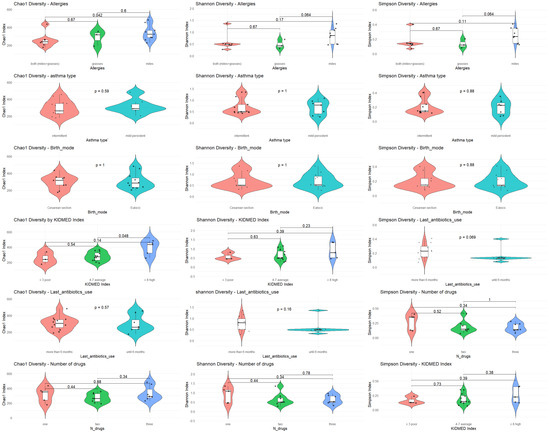 α diversity was analyzed with respect to the most significant variables: allergies, asthma type, mode of delivery, KIDMED score, antibiotic use, and type of medication. The analysis was performed using Chao1, Shannon, and Simpson diversity indices (Figure 1).