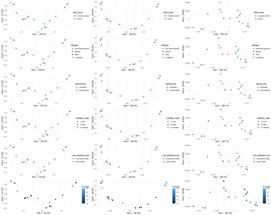 β diversity was analyzed with respect to the most significant variables: allergies, asthma type, mode of delivery, KIDMED score, antibiotic use, and number of medications taken. The analysis was performed using Bray–Curtis, Jaccard, and Manhattan metrics (Figure 2, Figure 3 and Figure 4).