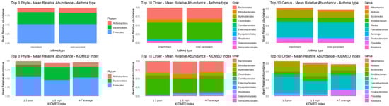 Comparisons of taxonomic profiles between intermittent and mild persistent asthma phenotypes revealed substantial overlap, with only modest numbers of exclusive taxa, suggesting that asthma phenotype does not exert a major influence on the presence or absence of taxa [9]. By contrast, dietary adherence was associated with more pronounced differences: low adherence was linked to markedly reduced richness and few unique taxa, whereas medium- and high-adherence groups displayed richer and more diverse profiles, consistent with greater microbial stability and resilience.