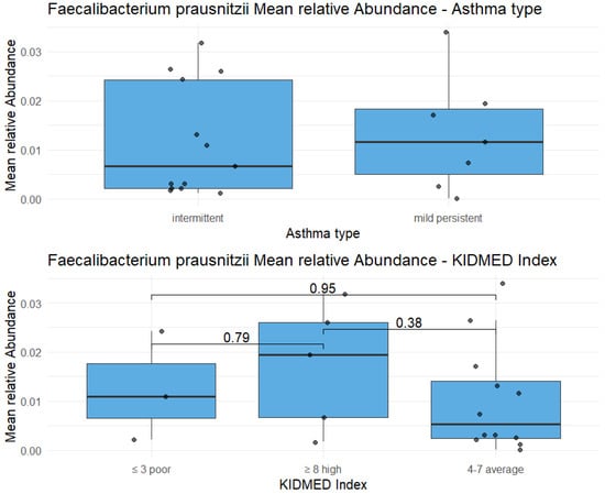 Highlight on Faecalibacterium prausnitzii: the relative abundance of this species doesn’t show statistically significant differences between two types of asthma (p-value = 0.72), as well as between three KIDMED scores (p-value in the figure).