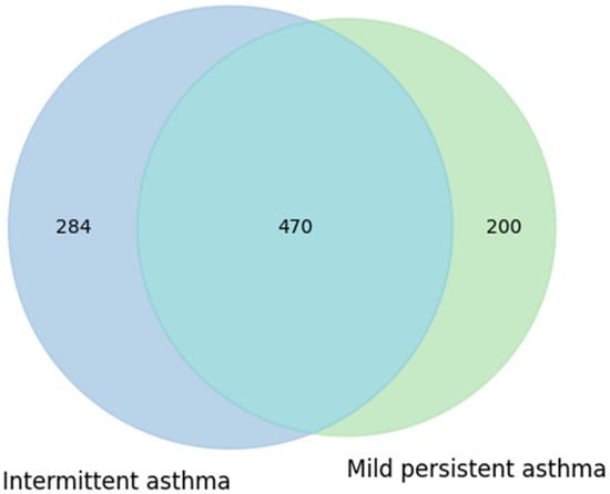 The diagram shows that the intermittent asthma group comprised 754 taxa, while the mild persistent asthma group comprised 670 taxa. The two groups shared a substantial number of taxa (470), with 284 taxa unique to the intermittent group and 200 taxa unique to the mild persistent group (Figure 5). This partial overlap suggests that, at the presence/absence level, no marked differences in taxonomic composition were observed between the two phenotypes. These results may indicate that the clinical characteristics of asthma do not substantially influence the variety of taxa present, although potential differences in relative abundance or metabolic functionality cannot be excluded.