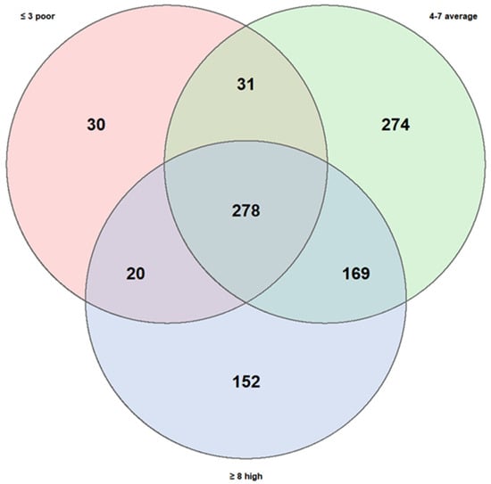 The high KIDMED score group comprised 619 taxa, the medium group 752, and the low group only 359, substantially fewer than the other two. The number of taxa shared across all three groups were 278, while the degree of overlap between specific pairs of groups varied considerably: